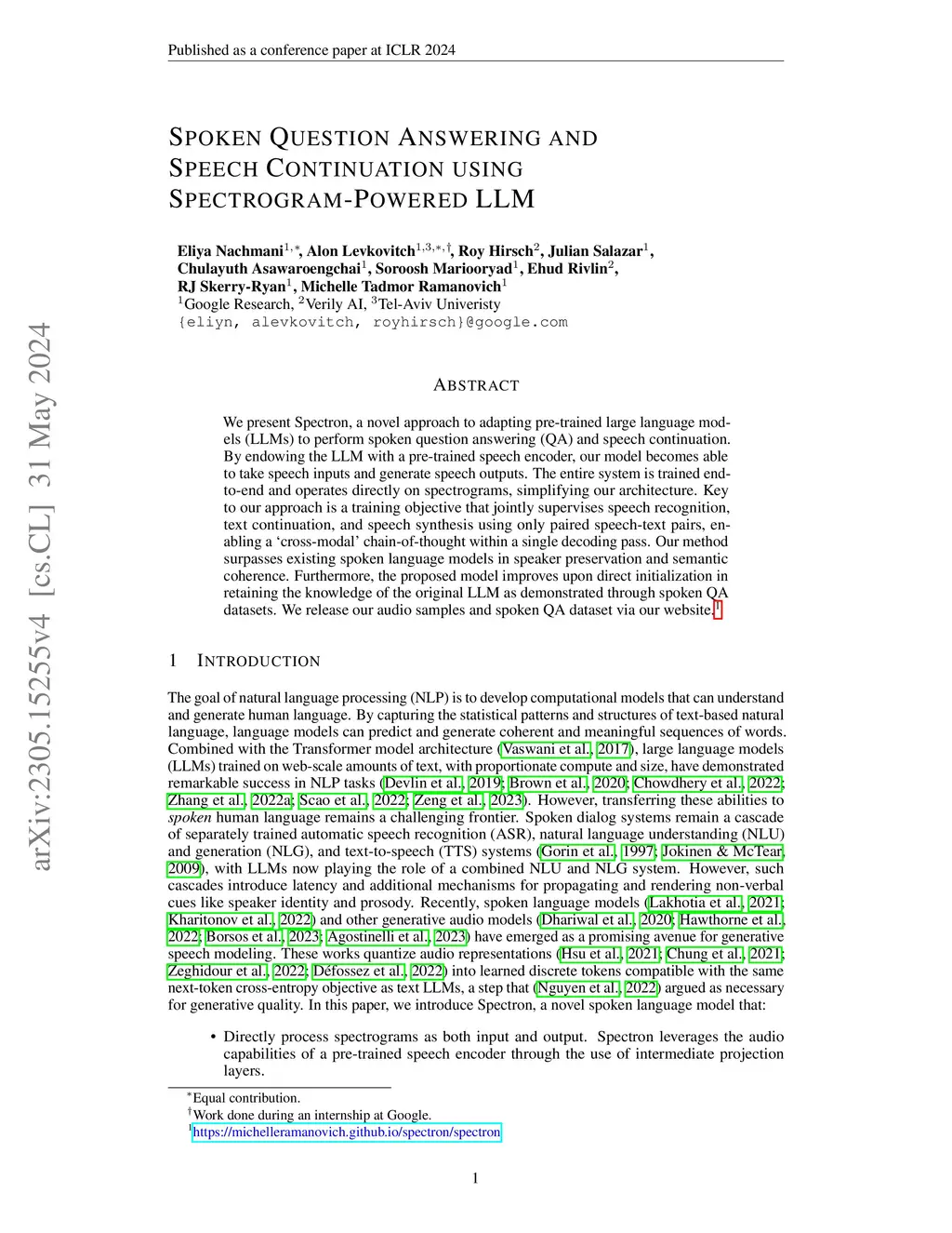 We present Spectron, a novel approach to adapting pre-trained large language models (LLMs) to perform spoken question answering (QA) and speech continuation. By endowing the LLM with a pre-trained speech encoder, our model becomes able to take speech inputs and generate speech outputs. The entire system is trained end-to-end and operates directly on spectrograms, simplifying our architecture. Key to our approach is a training objective that jointly supervises speech recognition, text continuation, and speech synthesis using only paired speech-text pairs, enabling a `cross-modal' chain-of-thought within a single decoding pass. Our method surpasses existing spoken language models in speaker preservation and semantic coherence. Furthermore, the proposed model improves upon direct initialization in retaining the knowledge of the original LLM as demonstrated through spoken QA datasets. We release our audio samples (https://michelleramanovich.github.io/spectron/spectron) and spoken QA dataset (https://github.com/google-research-datasets/LLAMA1-Test-Set).
