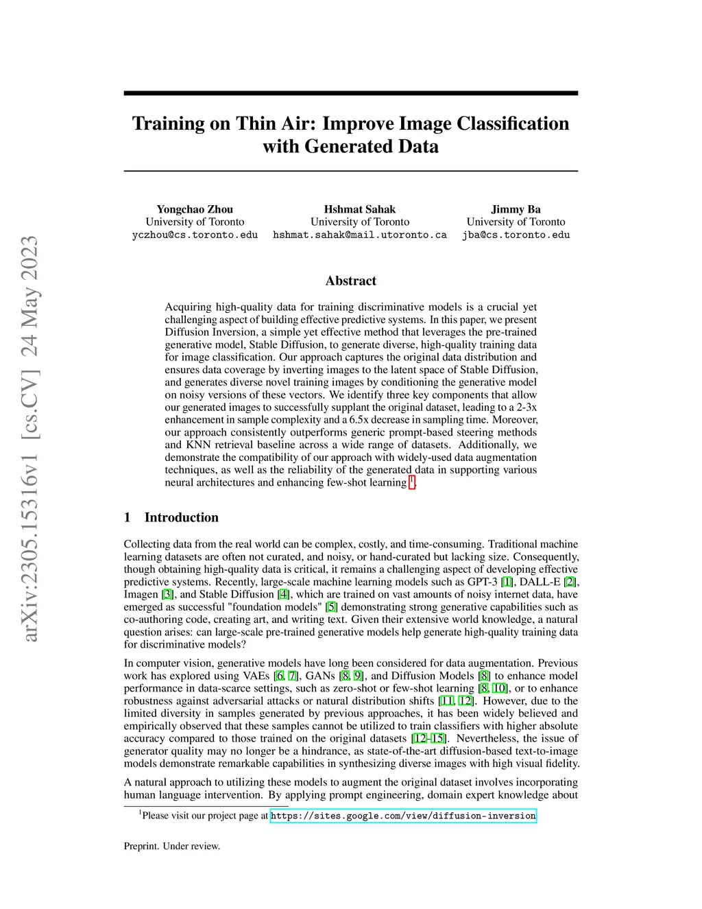 Acquiring high-quality data for training discriminative models is a crucial yet challenging aspect of building effective predictive systems. In this paper, we present Diffusion Inversion, a simple yet effective method that leverages the pre-trained generative model, Stable Diffusion, to generate diverse, high-quality training data for image classification. Our approach captures the original data distribution and ensures data coverage by inverting images to the latent space of Stable Diffusion, and generates diverse novel training images by conditioning the generative model on noisy versions of these vectors. We identify three key components that allow our generated images to successfully supplant the original dataset, leading to a 2-3x enhancement in sample complexity and a 6.5x decrease in sampling time. Moreover, our approach consistently outperforms generic prompt-based steering methods and KNN retrieval baseline across a wide range of datasets. Additionally, we demonstrate the compatibility of our approach with widely-used data augmentation techniques, as well as the reliability of the generated data in supporting various neural architectures and enhancing few-shot learning.