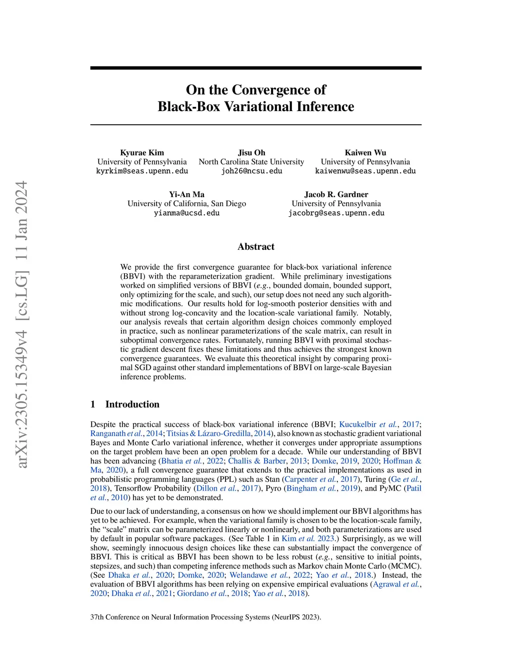 We provide the first convergence guarantee for full black-box variational inference (BBVI), also known as Monte Carlo variational inference. While preliminary investigations worked on simplified versions of BBVI (e.g., bounded domain, bounded support, only optimizing for the scale, and such), our setup does not need any such algorithmic modifications. Our results hold for log-smooth posterior densities with and without strong log-concavity and the location-scale variational family. Also, our analysis reveals that certain algorithm design choices commonly employed in practice, particularly, nonlinear parameterizations of the scale of the variational approximation, can result in suboptimal convergence rates. Fortunately, running BBVI with proximal stochastic gradient descent fixes these limitations, and thus achieves the strongest known convergence rate guarantees. We evaluate this theoretical insight by comparing proximal SGD against other standard implementations of BBVI on large-scale Bayesian inference problems.