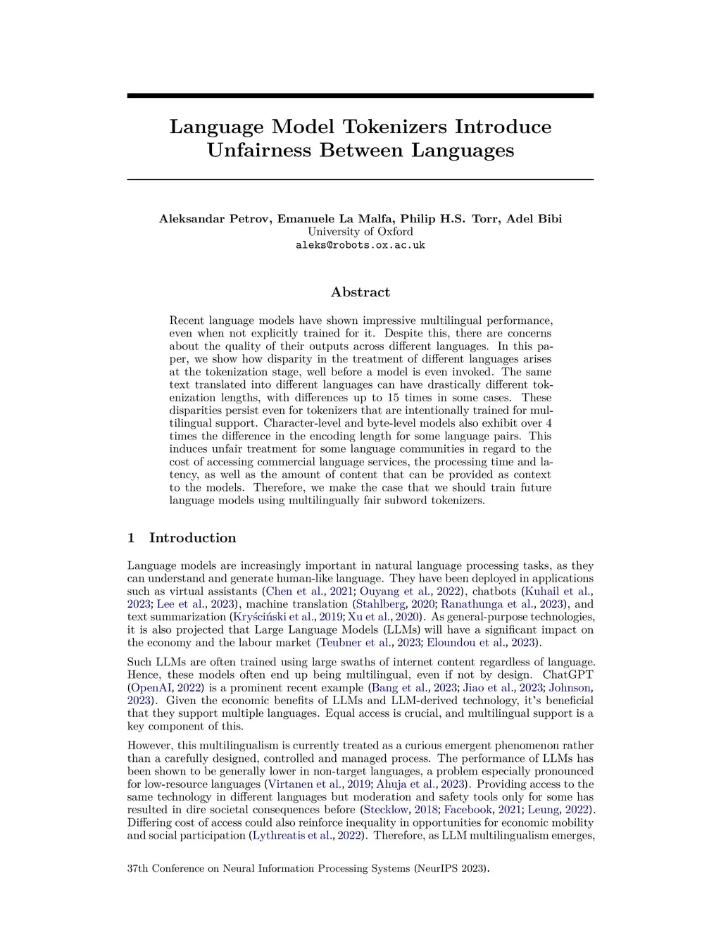 Recent language models have shown impressive multilingual performance, even when not explicitly trained for it. Despite this, there are concerns about the quality of their outputs across different languages. In this paper, we show how disparity in the treatment of different languages arises at the tokenization stage, well before a model is even invoked. The same text translated into different languages can have drastically different tokenization lengths, with differences up to 15 times in some cases. These disparities persist even for tokenizers that are intentionally trained for multilingual support. Character-level and byte-level models also exhibit over 4 times the difference in the encoding length for some language pairs. This induces unfair treatment for some language communities in regard to the cost of accessing commercial language services, the processing time and latency, as well as the amount of content that can be provided as context to the models. Therefore, we make the case that we should train future language models using multilingually fair subword tokenizers.
