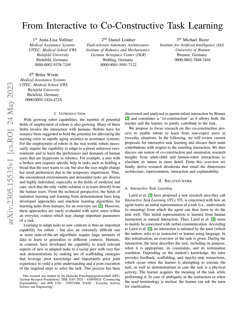 Humans have developed the capability to teach relevant aspects of new or adapted tasks to a social peer with very few task demonstrations by making use of scaffolding strategies that leverage prior knowledge and importantly prior joint experience to yield a joint understanding and a joint execution of the required steps to solve the task. This process has been discovered and analyzed in parent-infant interaction and constitutes a ``co-construction'' as it allows both, the teacher and the learner, to jointly contribute to the task. We propose to focus research in robot interactive learning on this co-construction process to enable robots to learn from non-expert users in everyday situations. In the following, we will review current proposals for interactive task learning and discuss their main contributions with respect to the entailing interaction. We then discuss our notion of co-construction and summarize research insights from adult-child and human-robot interactions to elucidate its nature in more detail. From this overview we finally derive research desiderata that entail the dimensions architecture, representation, interaction and explainability.
