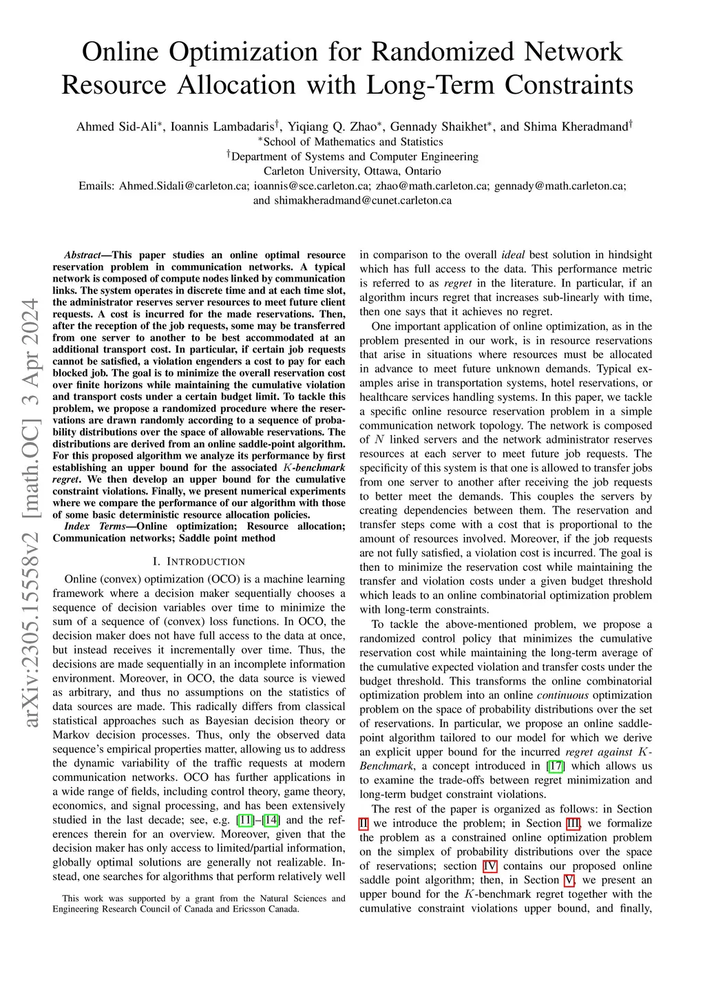 In this paper, we study an optimal online resource reservation problem in a simple communication network. The network is composed of two compute nodes linked by a local communication link. The system operates in discrete time; at each time slot, the administrator reserves resources for servers before the actual job requests are known. A cost is incurred for the reservations made. Then, after the client requests are observed, jobs may be transferred from one server to the other to best accommodate the demands by incurring an additional transport cost. If certain job requests cannot be satisfied, there is a violation that engenders a cost to pay for each of the blocked jobs. The goal is to minimize the overall reservation cost over finite horizons while maintaining the cumulative violation and transport costs under a certain budget limit. To study this problem, we first formalize it as a repeated game against nature where the reservations are drawn randomly according to a sequence of probability distributions that are derived from an online optimization problem over the space of allowable reservations. We then propose an online saddle-point algorithm for which we present an upper bound for the associated K-benchmark regret together with an upper bound for the cumulative constraint violations. Finally, we present numerical experiments where we compare the performance of our algorithm with those of simple deterministic resource allocation policies.