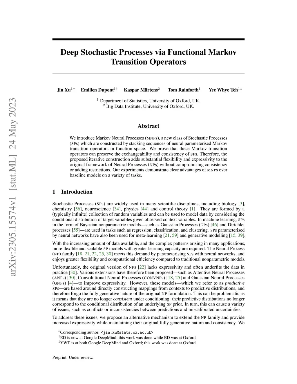 We introduce Markov Neural Processes (MNPs), a new class of Stochastic Processes (SPs) which are constructed by stacking sequences of neural parameterised Markov transition operators in function space. We prove that these Markov transition operators can preserve the exchangeability and consistency of SPs. Therefore, the proposed iterative construction adds substantial flexibility and expressivity to the original framework of Neural Processes (NPs) without compromising consistency or adding restrictions. Our experiments demonstrate clear advantages of MNPs over baseline models on a variety of tasks.