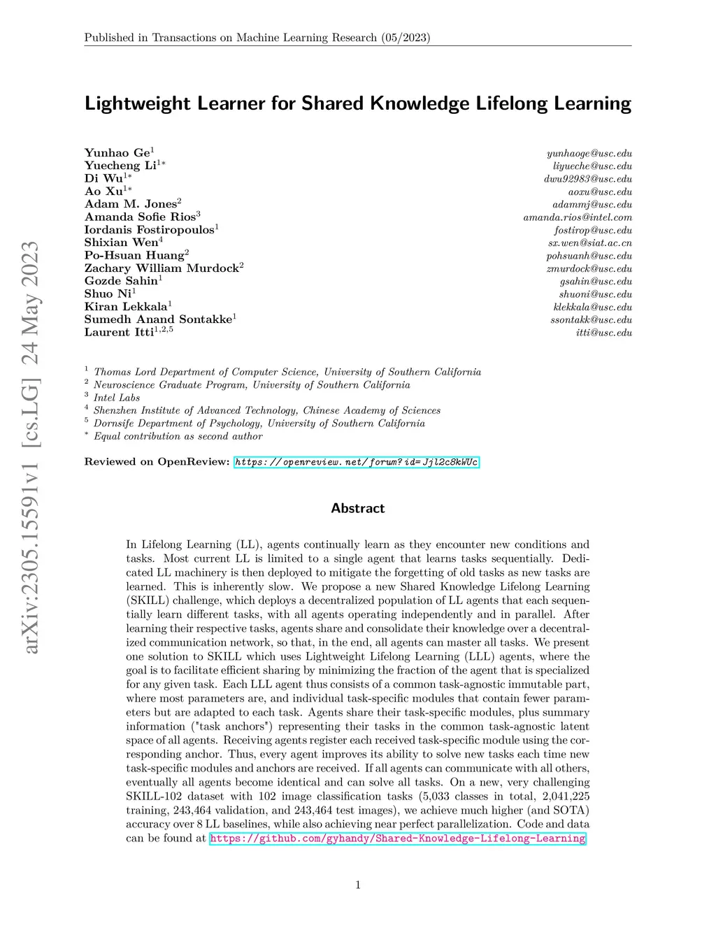 Lightweight Learner for Shared Knowledge Lifelong Learning
