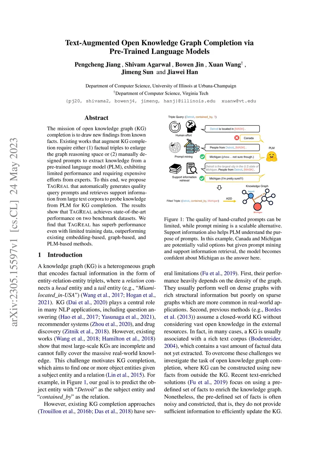 The mission of open knowledge graph (KG) completion is to draw new findings from known facts. Existing works that augment KG completion require either (1) factual triples to enlarge the graph reasoning space or (2) manually designed prompts to extract knowledge from a pre-trained language model (PLM), exhibiting limited performance and requiring expensive efforts from experts. To this end, we propose TAGREAL that automatically generates quality query prompts and retrieves support information from large text corpora to probe knowledge from PLM for KG completion. The results show that TAGREAL achieves state-of-the-art performance on two benchmark datasets. We find that TAGREAL has superb performance even with limited training data, outperforming existing embedding-based, graph-based, and PLM-based methods.