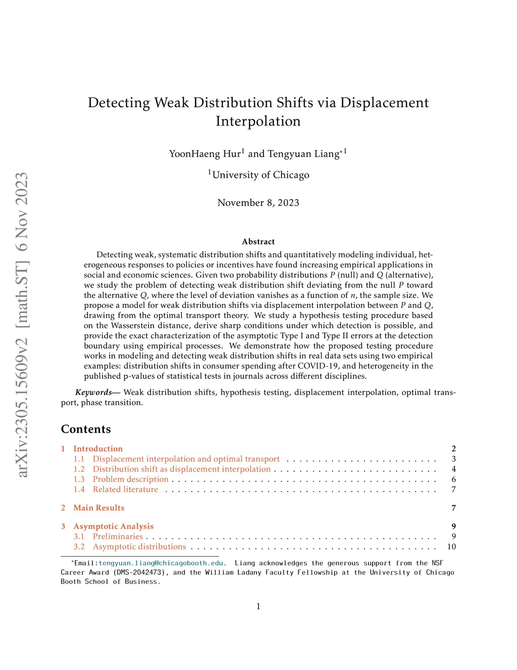 Detecting weak, systematic distribution shifts and quantitatively modeling individual, heterogeneous responses to policies or incentives have found increasing empirical applications in social and economic sciences. Given two probability distributions (null) and (alternative), we study the problem of detecting weak distribution shift deviating from the null toward the alternative , where the level of deviation vanishes as a function of , the sample size. We propose a model for weak distribution shifts via displacement interpolation between and , drawing from the optimal transport theory. We study a hypothesis testing procedure based on the Wasserstein distance, derive sharp conditions under which detection is possible, and provide the exact characterization of the asymptotic Type I and Type II errors at the detection boundary using empirical processes. We demonstrate how the proposed testing procedure works in modeling and detecting weak distribution shifts in real data sets using two empirical examples: distribution shifts in consumer spending after COVID-19, and heterogeneity in the published p-values of statistical tests in journals across different disciplines.