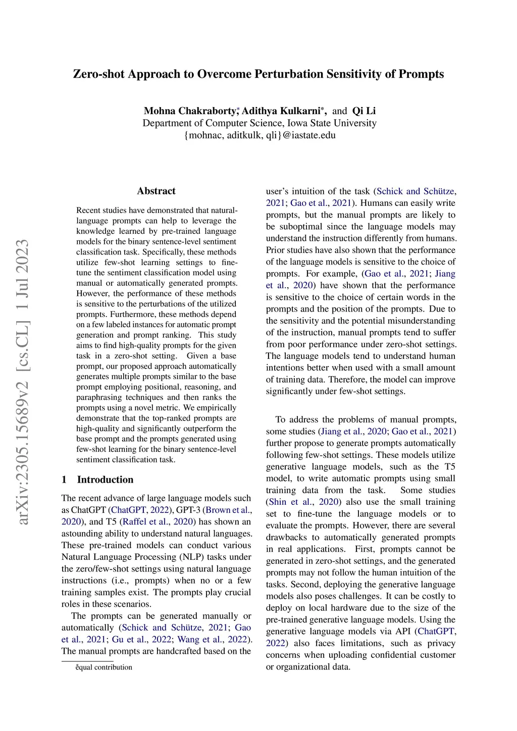 Recent studies have demonstrated that natural-language prompts can help to leverage the knowledge learned by pre-trained language models for the binary sentence-level sentiment classification task. Specifically, these methods utilize few-shot learning settings to fine-tune the sentiment classification model using manual or automatically generated prompts. However, the performance of these methods is sensitive to the perturbations of the utilized prompts. Furthermore, these methods depend on a few labeled instances for automatic prompt generation and prompt ranking. This study aims to find high-quality prompts for the given task in a zero-shot setting. Given a base prompt, our proposed approach automatically generates multiple prompts similar to the base prompt employing positional, reasoning, and paraphrasing techniques and then ranks the prompts using a novel metric. We empirically demonstrate that the top-ranked prompts are high-quality and significantly outperform the base prompt and the prompts generated using few-shot learning for the binary sentence-level sentiment classification task.