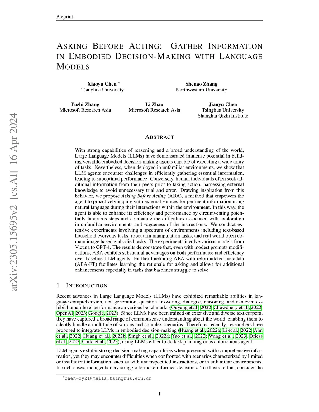 With strong capabilities of reasoning and a broad understanding of the world, Large Language Models (LLMs) have demonstrated immense potential in building versatile embodied decision-making agents capable of executing a wide array of tasks. Nevertheless, when deployed in unfamiliar environments, we show that LLM agents encounter challenges in efficiently gathering essential information, leading to suboptimal performance. Conversely, human individuals often seek additional information from their peers prior to taking action, harnessing external knowledge to avoid unnecessary trial and error. Drawing inspiration from this behavior, we propose \textit{Asking Before Acting} (ABA), a method that empowers the agent to proactively inquire with external sources for pertinent information using natural language during their interactions within the environment. In this way, the agent is able to enhance its efficiency and performance by circumventing potentially laborious steps and combating the difficulties associated with exploration in unfamiliar environments and vagueness of the instructions. We conduct extensive experiments involving a spectrum of environments including text-based household everyday tasks, robot arm manipulation tasks, and real world open domain image based embodied tasks. The experiments involve various models from Vicuna to GPT-4. The results demonstrate that, even with modest prompts modifications, ABA exhibits substantial advantages on both performance and efficiency over baseline LLM agents. Further finetuning ABA with reformulated metadata (ABA-FT) faciliates learning the rationale for asking and allows for additional enhancements especially in tasks that baselines struggle to solve.