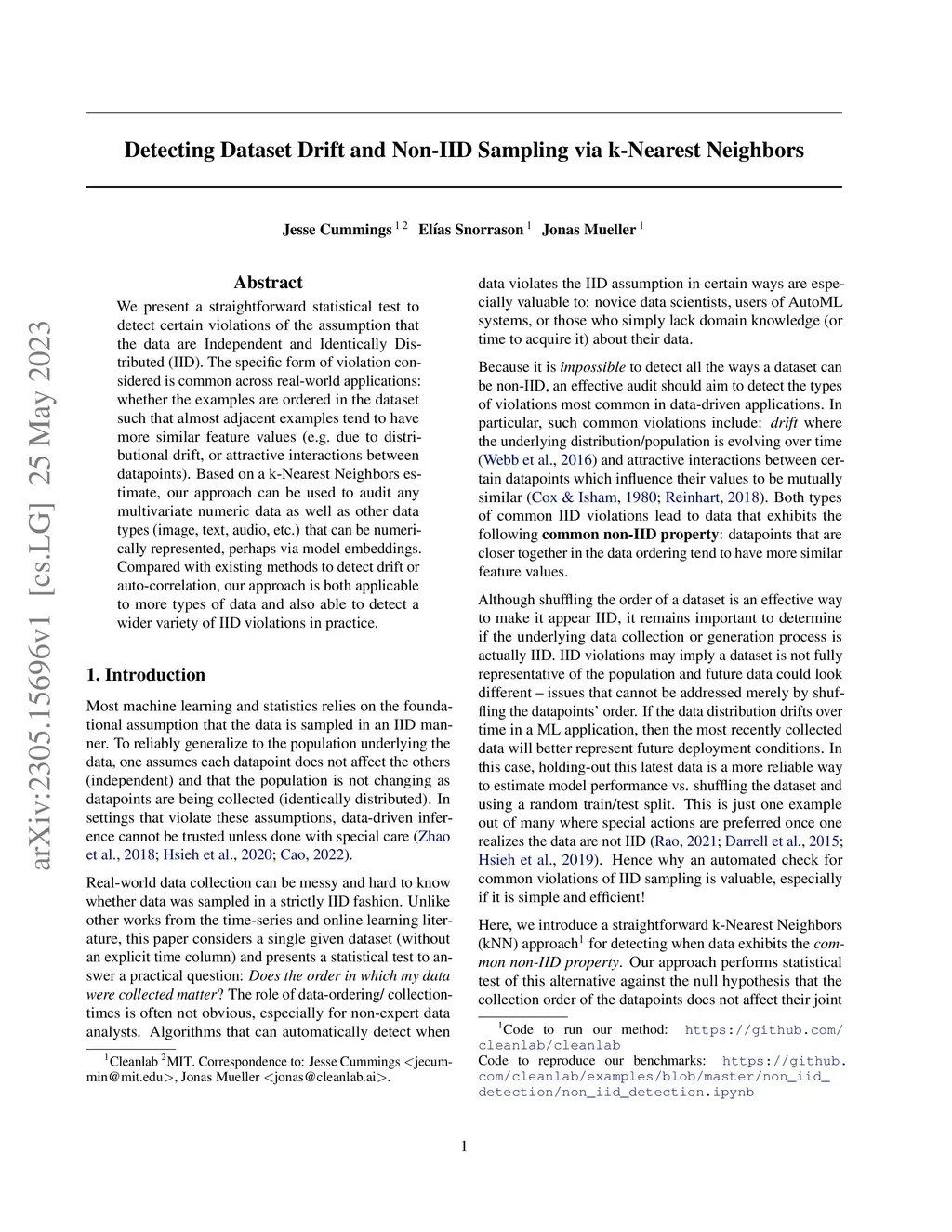 We present a straightforward statistical test to detect certain violations of the assumption that the data are Independent and Identically Distributed (IID). The specific form of violation considered is common across real-world applications: whether the examples are ordered in the dataset such that almost adjacent examples tend to have more similar feature values (e.g. due to distributional drift, or attractive interactions between datapoints). Based on a k-Nearest Neighbors estimate, our approach can be used to audit any multivariate numeric data as well as other data types (image, text, audio, etc.) that can be numerically represented, perhaps with model embeddings. Compared with existing methods to detect drift or auto-correlation, our approach is both applicable to more types of data and also able to detect a wider variety of IID violations in practice. Code: https://github.com/cleanlab/cleanlab