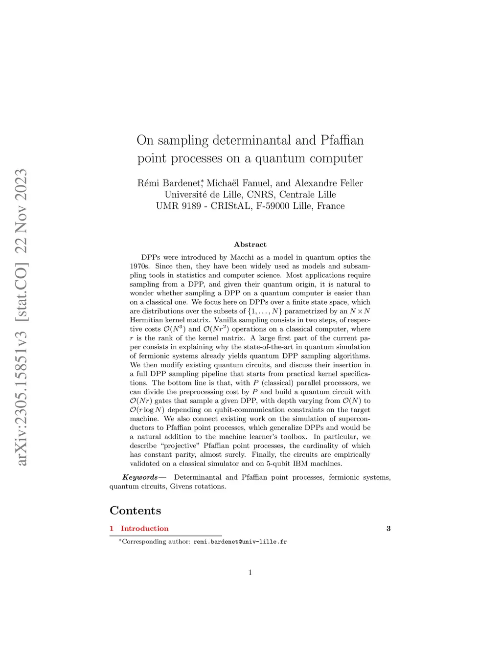 DPPs were introduced by Macchi as a model in quantum optics the 1970s. Since then, they have been widely used as models and subsampling tools in statistics and computer science. Most applications require sampling from a DPP, and given their quantum origin, it is natural to wonder whether sampling a DPP on a quantum computer is easier than on a classical one. We focus here on DPPs over a finite state space, which are distributions over the subsets of parametrized by an Hermitian kernel matrix. Vanilla sampling consists in two steps, of respective costs and operations on a classical computer, where is the rank of the kernel matrix. A large first part of the current paper consists in explaining why the state-of-the-art in quantum simulation of fermionic systems already yields quantum DPP sampling algorithms. We then modify existing quantum circuits, and discuss their insertion in a full DPP sampling pipeline that starts from practical kernel specifications. The bottom line is that, with (classical) parallel processors, we can divide the preprocessing cost by and build a quantum circuit with gates that sample a given DPP, with depth varying from to depending on qubit-communication constraints on the target machine. We also connect existing work on the simulation of superconductors to Pfaffian point processes, which generalize DPPs and would be a natural addition to the machine learner's toolbox. In particular, we describe "projective" Pfaffian point processes, the cardinality of which has constant parity, almost surely. Finally, the circuits are empirically validated on a classical simulator and on 5-qubit IBM machines.