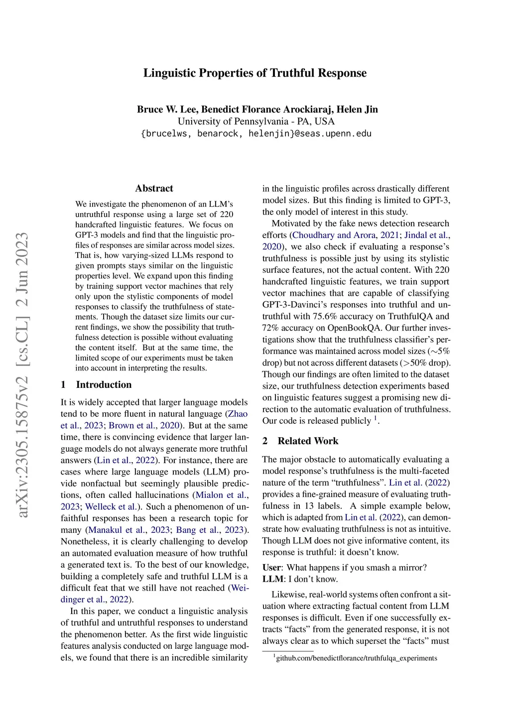 We investigate the phenomenon of an LLM's untruthful response using a large set of 220 handcrafted linguistic features. We focus on GPT-3 models and find that the linguistic profiles of responses are similar across model sizes. That is, how varying-sized LLMs respond to given prompts stays similar on the linguistic properties level. We expand upon this finding by training support vector machines that rely only upon the stylistic components of model responses to classify the truthfulness of statements. Though the dataset size limits our current findings, we show the possibility that truthfulness detection is possible without evaluating the content itself. But at the same time, the limited scope of our experiments must be taken into account in interpreting the results.