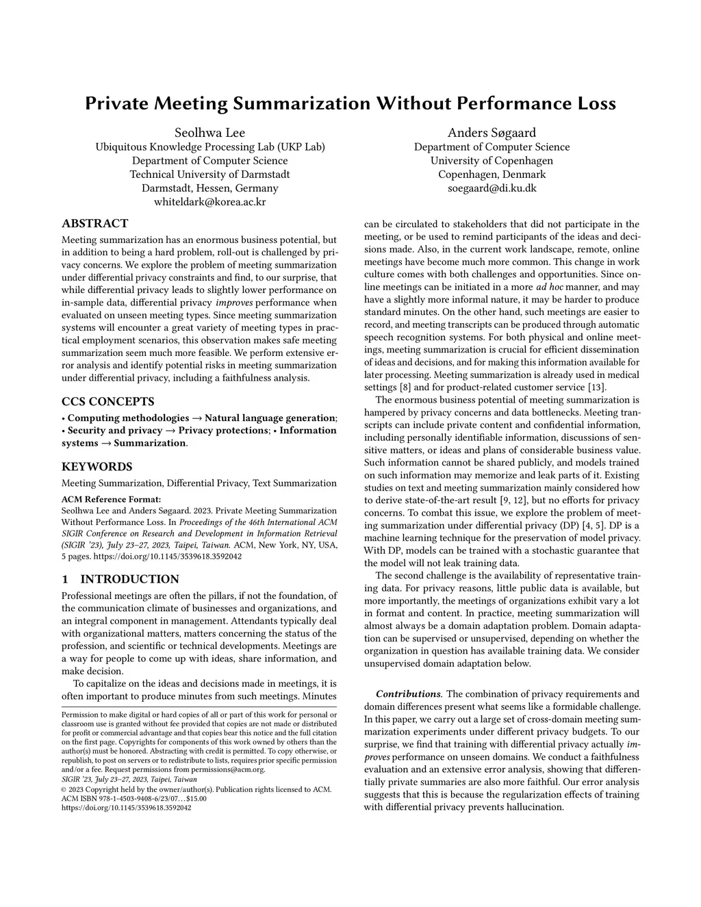 Private Meeting Summarization Without Performance Loss