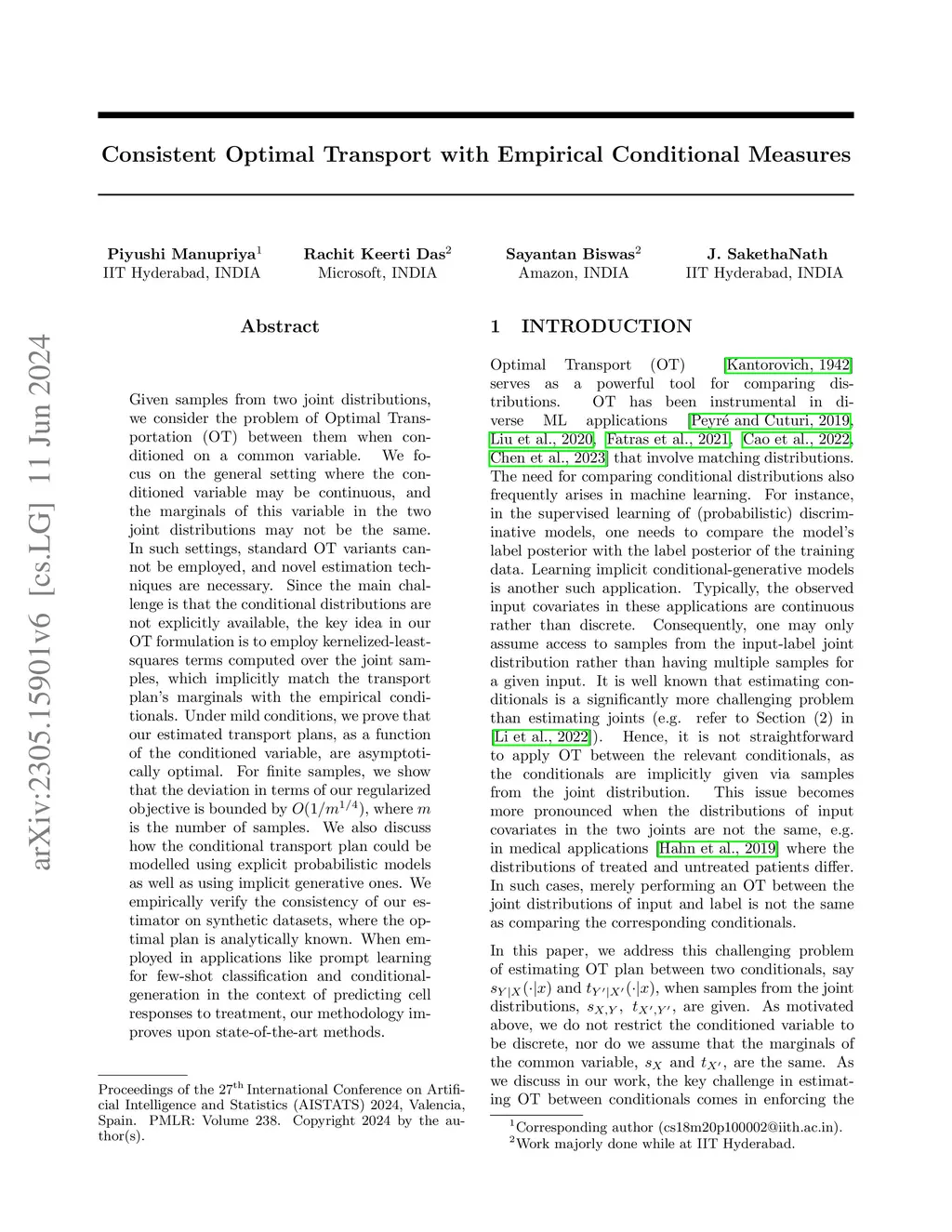 Given samples from two joint distributions, we consider the problem of Optimal Transportation (OT) between them when conditioned on a common variable. We focus on the general setting where the conditioned variable may be continuous, and the marginals of this variable in the two joint distributions may not be the same. In such settings, standard OT variants cannot be employed, and novel estimation techniques are necessary. Since the main challenge is that the conditional distributions are not explicitly available, the key idea in our OT formulation is to employ kernelized-least-squares terms computed over the joint samples, which implicitly match the transport plan's marginals with the empirical conditionals. Under mild conditions, we prove that our estimated transport plans, as a function of the conditioned variable, are asymptotically optimal. For finite samples, we show that the deviation in terms of our regularized objective is bounded by , where is the number of samples. We also discuss how the conditional transport plan could be modelled using explicit probabilistic models as well as using implicit generative ones. We empirically verify the consistency of our estimator on synthetic datasets, where the optimal plan is analytically known. When employed in applications like prompt learning for few-shot classification and conditional-generation in the context of predicting cell responses to treatment, our methodology improves upon state-of-the-art methods.