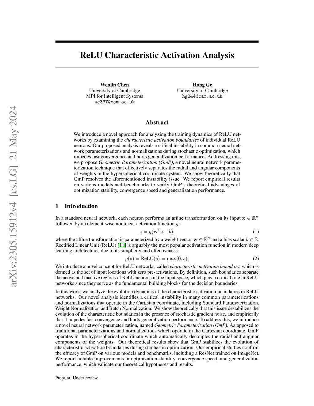 We introduce a novel approach for analyzing the training dynamics of ReLU networks by examining the characteristic activation boundaries of individual ReLU neurons. Our proposed analysis reveals a critical instability in common neural network parameterizations and normalizations during stochastic optimization, which impedes fast convergence and hurts generalization performance. Addressing this, we propose Geometric Parameterization (GmP), a novel neural network parameterization technique that effectively separates the radial and angular components of weights in the hyperspherical coordinate system. We show theoretically that GmP resolves the aforementioned instability issue. We report empirical results on various models and benchmarks to verify GmP's theoretical advantages of optimization stability, convergence speed and generalization performance.