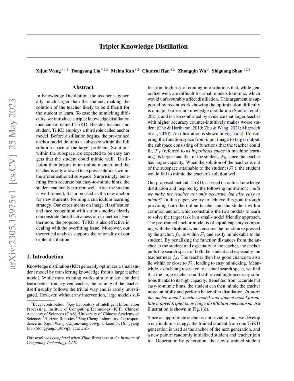 In Knowledge Distillation, the teacher is generally much larger than the student, making the solution of the teacher likely to be difficult for the student to learn. To ease the mimicking difficulty, we introduce a triplet knowledge distillation mechanism named TriKD. Besides teacher and student, TriKD employs a third role called anchor model. Before distillation begins, the pre-trained anchor model delimits a subspace within the full solution space of the target problem. Solutions within the subspace are expected to be easy targets that the student could mimic well. Distillation then begins in an online manner, and the teacher is only allowed to express solutions within the aforementioned subspace. Surprisingly, benefiting from accurate but easy-to-mimic hints, the student can finally perform well. After the student is well trained, it can be used as the new anchor for new students, forming a curriculum learning strategy. Our experiments on image classification and face recognition with various models clearly demonstrate the effectiveness of our method. Furthermore, the proposed TriKD is also effective in dealing with the overfitting issue. Moreover, our theoretical analysis supports the rationality of our triplet distillation.