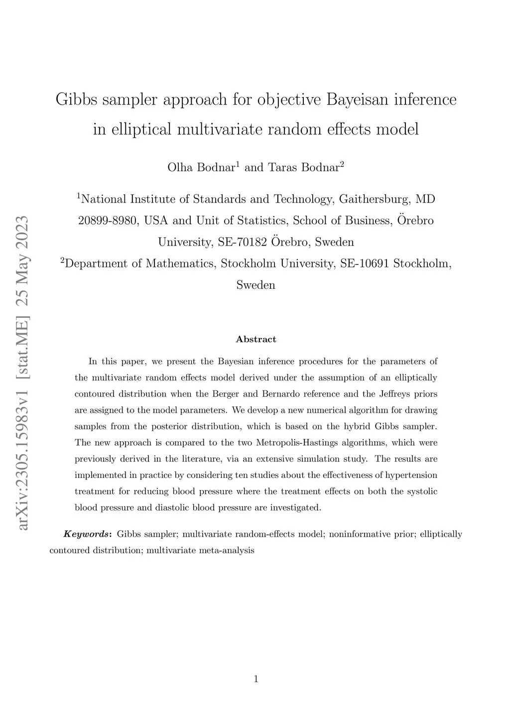 In this paper, we present the Bayesian inference procedures for the parameters of the multivariate random effects model derived under the assumption of an elliptically contoured distribution when the Berger and Bernardo reference and the Jeffreys priors are assigned to the model parameters. We develop a new numerical algorithm for drawing samples from the posterior distribution, which is based on the hybrid Gibbs sampler. The new approach is compared to the two Metropolis-Hastings algorithms, which were previously derived in the literature, via an extensive simulation study. The results are implemented in practice by considering ten studies about the effectiveness of hypertension treatment for reducing blood pressure where the treatment effects on both the systolic blood pressure and diastolic blood pressure are investigated.