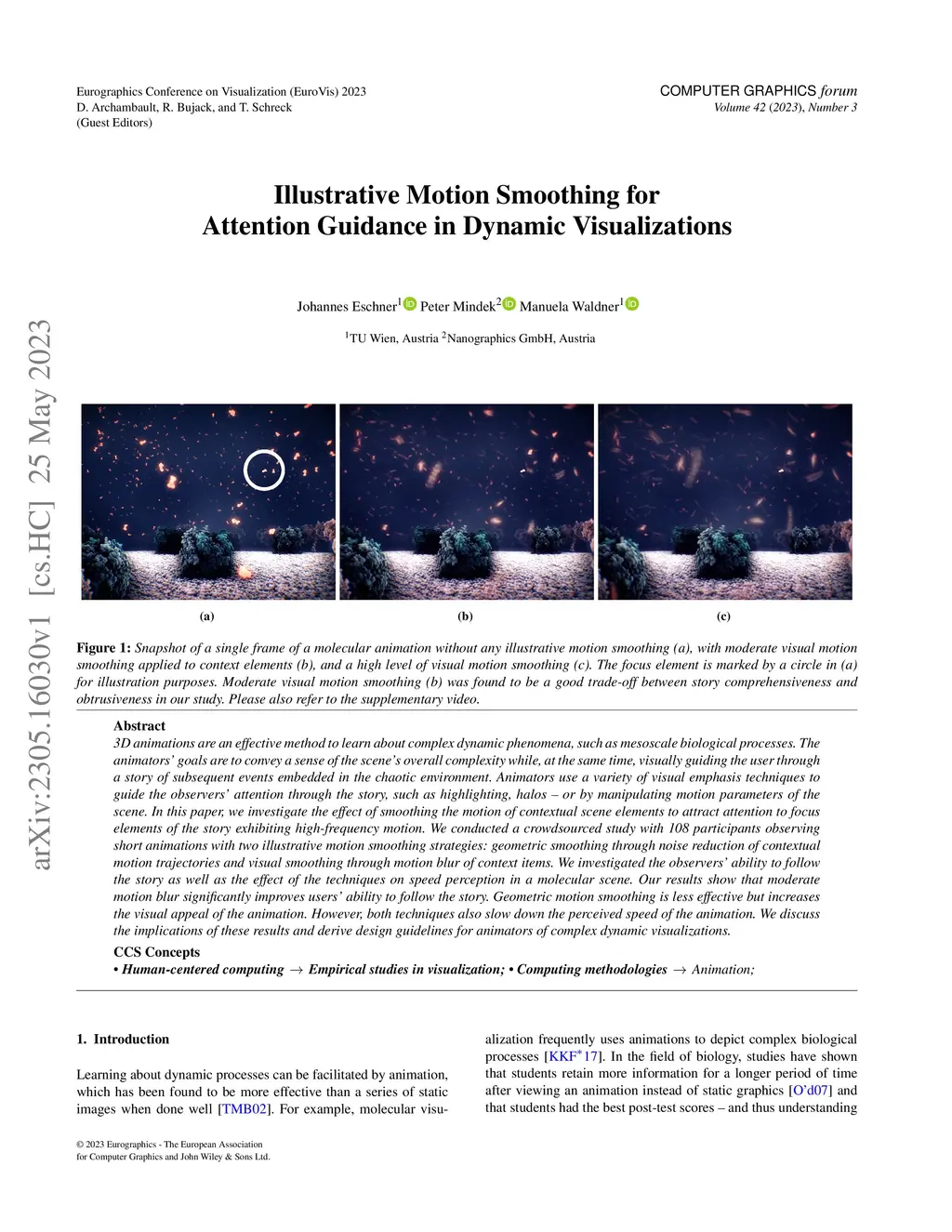 3D animations are an effective method to learn about complex dynamic phenomena, such as mesoscale biological processes. The animators' goals are to convey a sense of the scene's overall complexity while, at the same time, visually guiding the user through a story of subsequent events embedded in the chaotic environment. Animators use a variety of visual emphasis techniques to guide the observers' attention through the story, such as highlighting, halos -- or by manipulating motion parameters of the scene. In this paper, we investigate the effect of smoothing the motion of contextual scene elements to attract attention to focus elements of the story exhibiting high-frequency motion. We conducted a crowdsourced study with 108 participants observing short animations with two illustrative motion smoothing strategies: geometric smoothing through noise reduction of contextual motion trajectories and visual smoothing through motion blur of \rev{context} items. We investigated the observers' ability to follow the story as well as the effect of the techniques on speed perception in a molecular scene. Our results show that moderate motion blur significantly improves users' ability to follow the story. Geometric motion smoothing is less effective but increases the visual appeal of the animation. However, both techniques also slow down the perceived speed of the animation. We discuss the implications of these results and derive design guidelines for animators of complex dynamic visualizations.