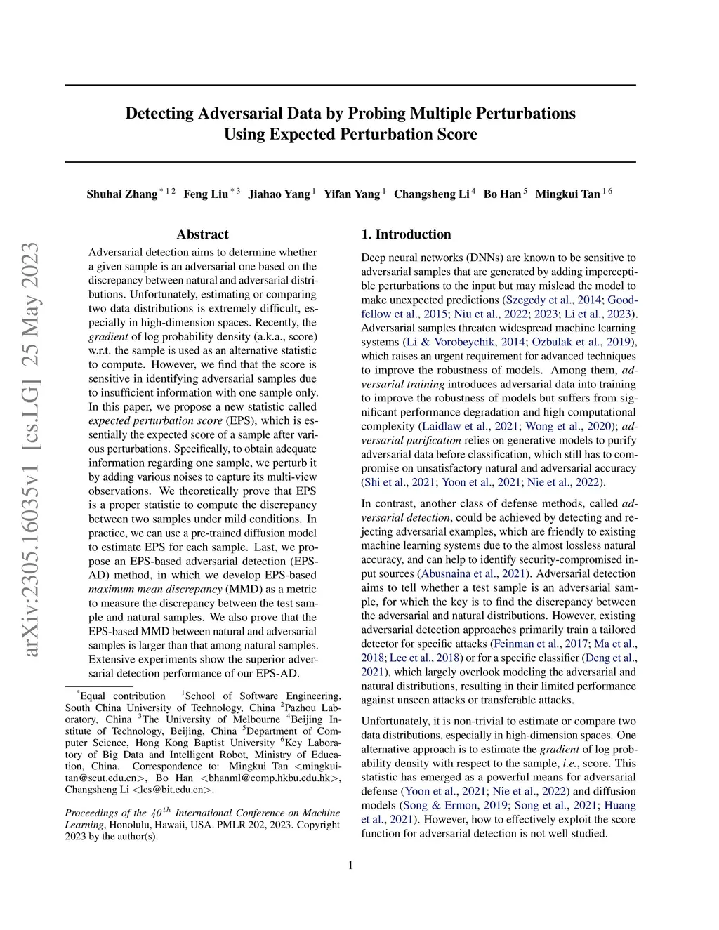 Adversarial detection aims to determine whether a given sample is an adversarial one based on the discrepancy between natural and adversarial distributions. Unfortunately, estimating or comparing two data distributions is extremely difficult, especially in high-dimension spaces. Recently, the gradient of log probability density (a.k.a., score) w.r.t. the sample is used as an alternative statistic to compute. However, we find that the score is sensitive in identifying adversarial samples due to insufficient information with one sample only. In this paper, we propose a new statistic called expected perturbation score (EPS), which is essentially the expected score of a sample after various perturbations. Specifically, to obtain adequate information regarding one sample, we perturb it by adding various noises to capture its multi-view observations. We theoretically prove that EPS is a proper statistic to compute the discrepancy between two samples under mild conditions. In practice, we can use a pre-trained diffusion model to estimate EPS for each sample. Last, we propose an EPS-based adversarial detection (EPS-AD) method, in which we develop EPS-based maximum mean discrepancy (MMD) as a metric to measure the discrepancy between the test sample and natural samples. We also prove that the EPS-based MMD between natural and adversarial samples is larger than that among natural samples. Extensive experiments show the superior adversarial detection performance of our EPS-AD.