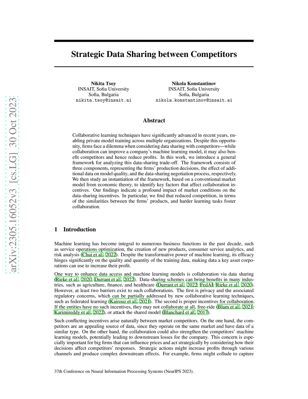 Collaborative learning techniques have significantly advanced in recent years, enabling private model training across multiple organizations. Despite this opportunity, firms face a dilemma when considering data sharing with competitors -- while collaboration can improve a company's machine learning model, it may also benefit competitors and hence reduce profits. In this work, we introduce a general framework for analyzing this data-sharing trade-off. The framework consists of three components, representing the firms' production decisions, the effect of additional data on model quality, and the data-sharing negotiation process, respectively. We then study an instantiation of the framework, based on a conventional market model from economic theory, to identify key factors that affect collaboration incentives. Our findings indicate a profound impact of market conditions on the data-sharing incentives. In particular, we find that reduced competition, in terms of the similarities between the firms' products, and harder learning tasks foster collaboration.