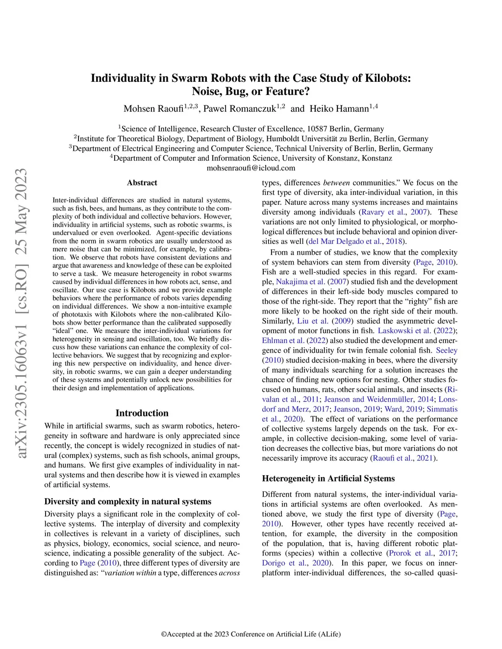 Individuality in Swarm Robots with the Case Study of Kilobots: Noise,