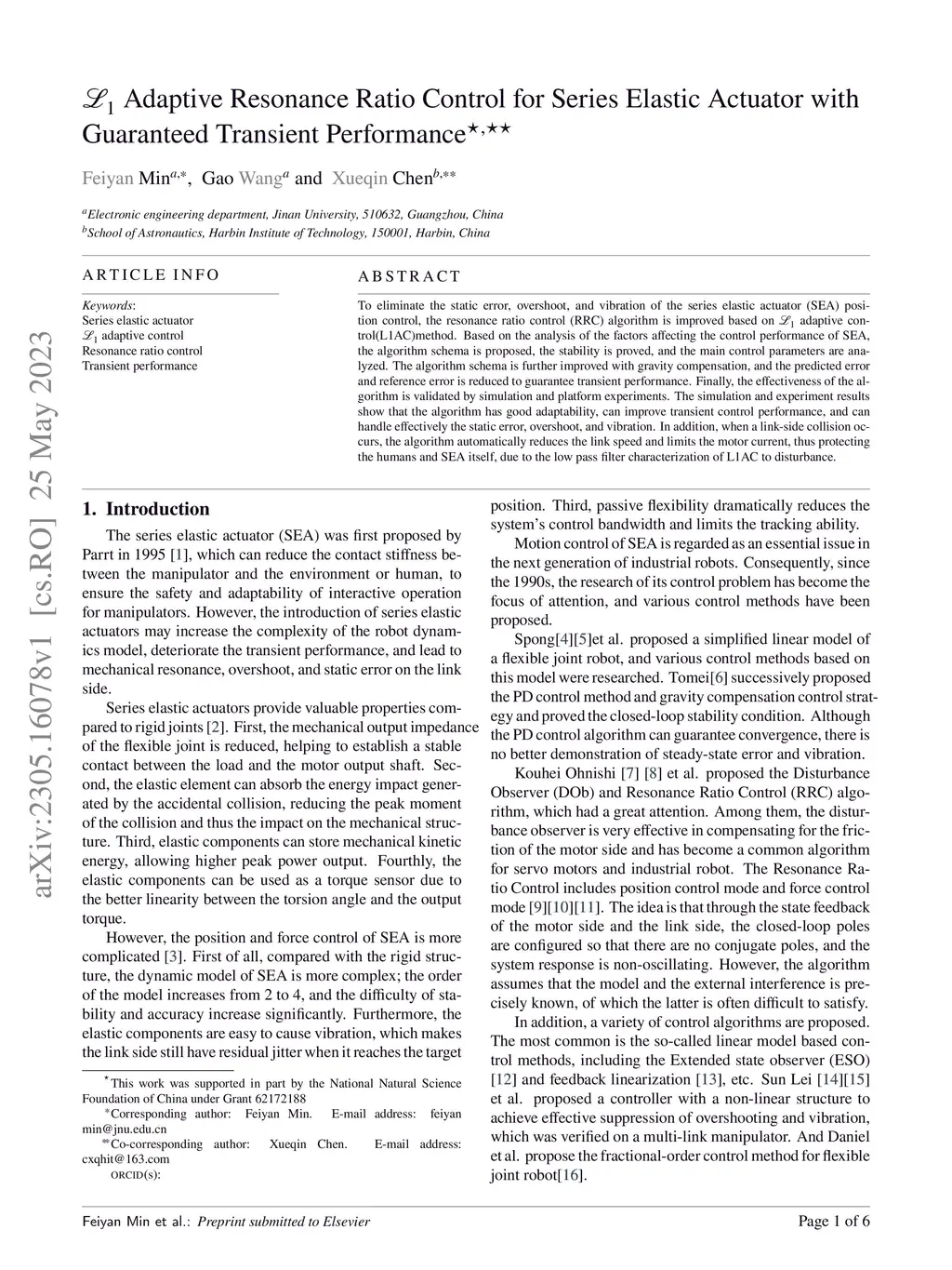 To eliminate the static error, overshoot, and vibration of the series elastic actuator (SEA) position control, the resonance ratio control (RRC) algorithm is improved based on L1 adaptive control(L1AC)method. Based on the analysis of the factors affecting the control performance of SEA, the algorithm schema is proposed, the stability is proved, and the main control parameters are analyzed. The algorithm schema is further improved with gravity compensation, and the predicted error and reference error is reduced to guarantee transient performance. Finally, the effectiveness of the algorithm is validated by simulation and platform experiments. The simulation and experiment results show that the algorithm has good adaptability, can improve transient control performance, and can handle effectively the static error, overshoot, and vibration. In addition, when a link-side collision occurs, the algorithm automatically reduces the link speed and limits the motor current, thus protecting the humans and SEA itself, due to the low pass filter characterization of L1AC to disturbance.