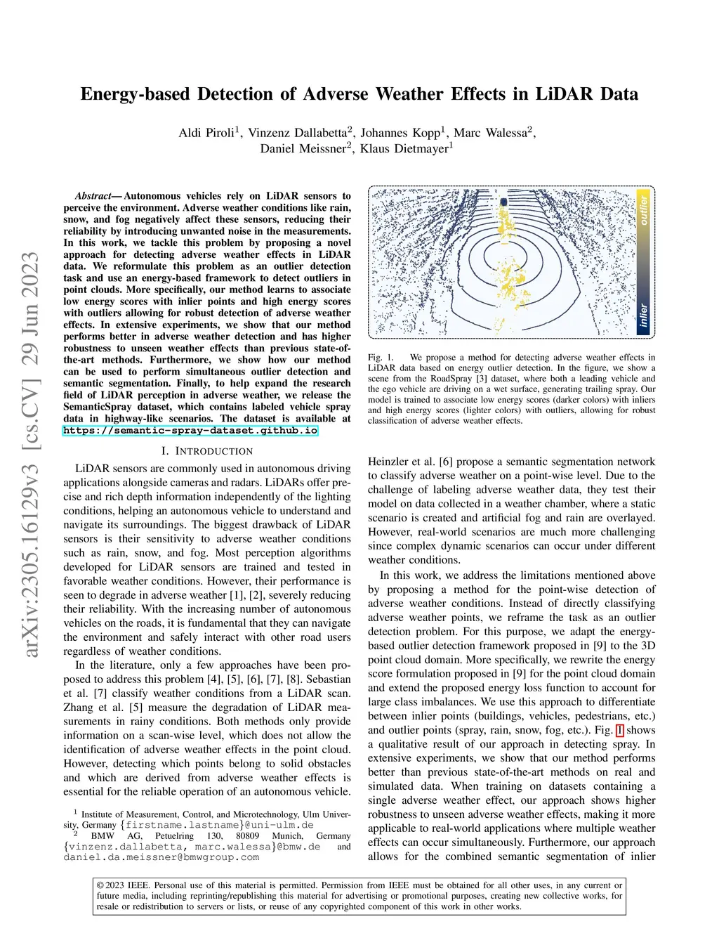 Autonomous vehicles rely on LiDAR sensors to perceive the environment. Adverse weather conditions like rain, snow, and fog negatively affect these sensors, reducing their reliability by introducing unwanted noise in the measurements. In this work, we tackle this problem by proposing a novel approach for detecting adverse weather effects in LiDAR data. We reformulate this problem as an outlier detection task and use an energy-based framework to detect outliers in point clouds. More specifically, our method learns to associate low energy scores with inlier points and high energy scores with outliers allowing for robust detection of adverse weather effects. In extensive experiments, we show that our method performs better in adverse weather detection and has higher robustness to unseen weather effects than previous state-of-the-art methods. Furthermore, we show how our method can be used to perform simultaneous outlier detection and semantic segmentation. Finally, to help expand the research field of LiDAR perception in adverse weather, we release the SemanticSpray dataset, which contains labeled vehicle spray data in highway-like scenarios. The dataset is available at https://semantic-spray-dataset.github.io .