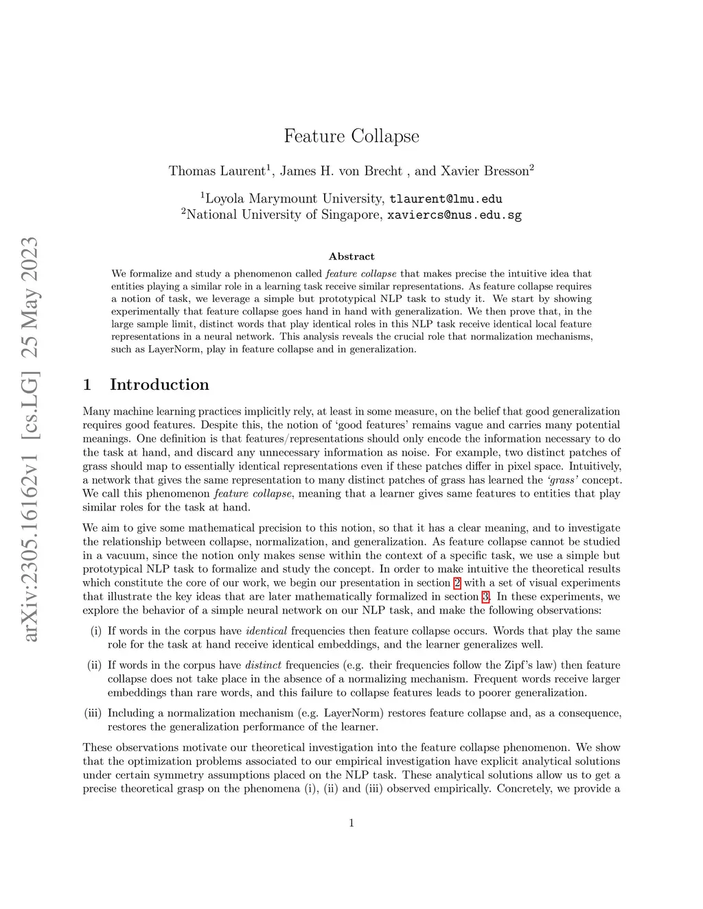 We formalize and study a phenomenon called feature collapse that makes precise the intuitive idea that entities playing a similar role in a learning task receive similar representations. As feature collapse requires a notion of task, we leverage a simple but prototypical NLP task to study it. We start by showing experimentally that feature collapse goes hand in hand with generalization. We then prove that, in the large sample limit, distinct words that play identical roles in this NLP task receive identical local feature representations in a neural network. This analysis reveals the crucial role that normalization mechanisms, such as LayerNorm, play in feature collapse and in generalization.