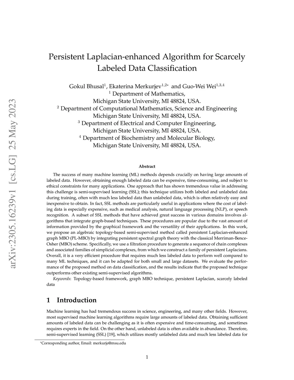 The success of many machine learning (ML) methods depends crucially on having large amounts of labeled data. However, obtaining enough labeled data can be expensive, time-consuming, and subject to ethical constraints for many applications. One approach that has shown tremendous value in addressing this challenge is semi-supervised learning (SSL); this technique utilizes both labeled and unlabeled data during training, often with much less labeled data than unlabeled data, which is often relatively easy and inexpensive to obtain. In fact, SSL methods are particularly useful in applications where the cost of labeling data is especially expensive, such as medical analysis, natural language processing (NLP), or speech recognition. A subset of SSL methods that have achieved great success in various domains involves algorithms that integrate graph-based techniques. These procedures are popular due to the vast amount of information provided by the graphical framework and the versatility of their applications. In this work, we propose an algebraic topology-based semi-supervised method called persistent Laplacian-enhanced graph MBO (PL-MBO) by integrating persistent spectral graph theory with the classical Merriman-Bence- Osher (MBO) scheme. Specifically, we use a filtration procedure to generate a sequence of chain complexes and associated families of simplicial complexes, from which we construct a family of persistent Laplacians. Overall, it is a very efficient procedure that requires much less labeled data to perform well compared to many ML techniques, and it can be adapted for both small and large datasets. We evaluate the performance of the proposed method on data classification, and the results indicate that the proposed technique outperforms other existing semi-supervised algorithms.