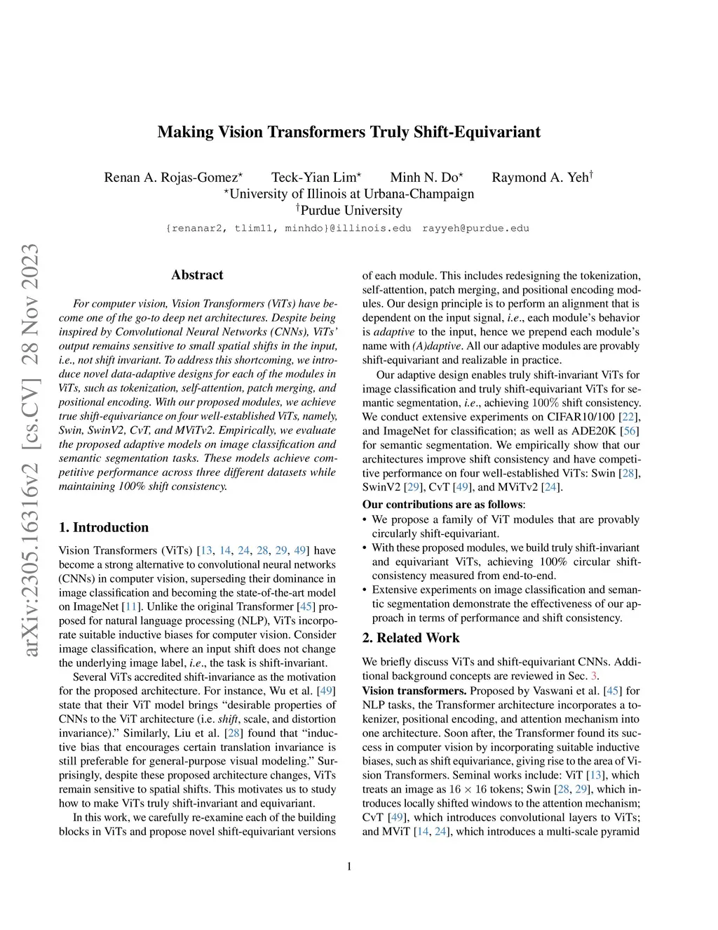 For computer vision, Vision Transformers (ViTs) have become one of the go-to deep net architectures. Despite being inspired by Convolutional Neural Networks (CNNs), ViTs' output remains sensitive to small spatial shifts in the input, i.e., not shift invariant. To address this shortcoming, we introduce novel data-adaptive designs for each of the modules in ViTs, such as tokenization, self-attention, patch merging, and positional encoding. With our proposed modules, we achieve true shift-equivariance on four well-established ViTs, namely, Swin, SwinV2, CvT, and MViTv2. Empirically, we evaluate the proposed adaptive models on image classification and semantic segmentation tasks. These models achieve competitive performance across three different datasets while maintaining 100% shift consistency.