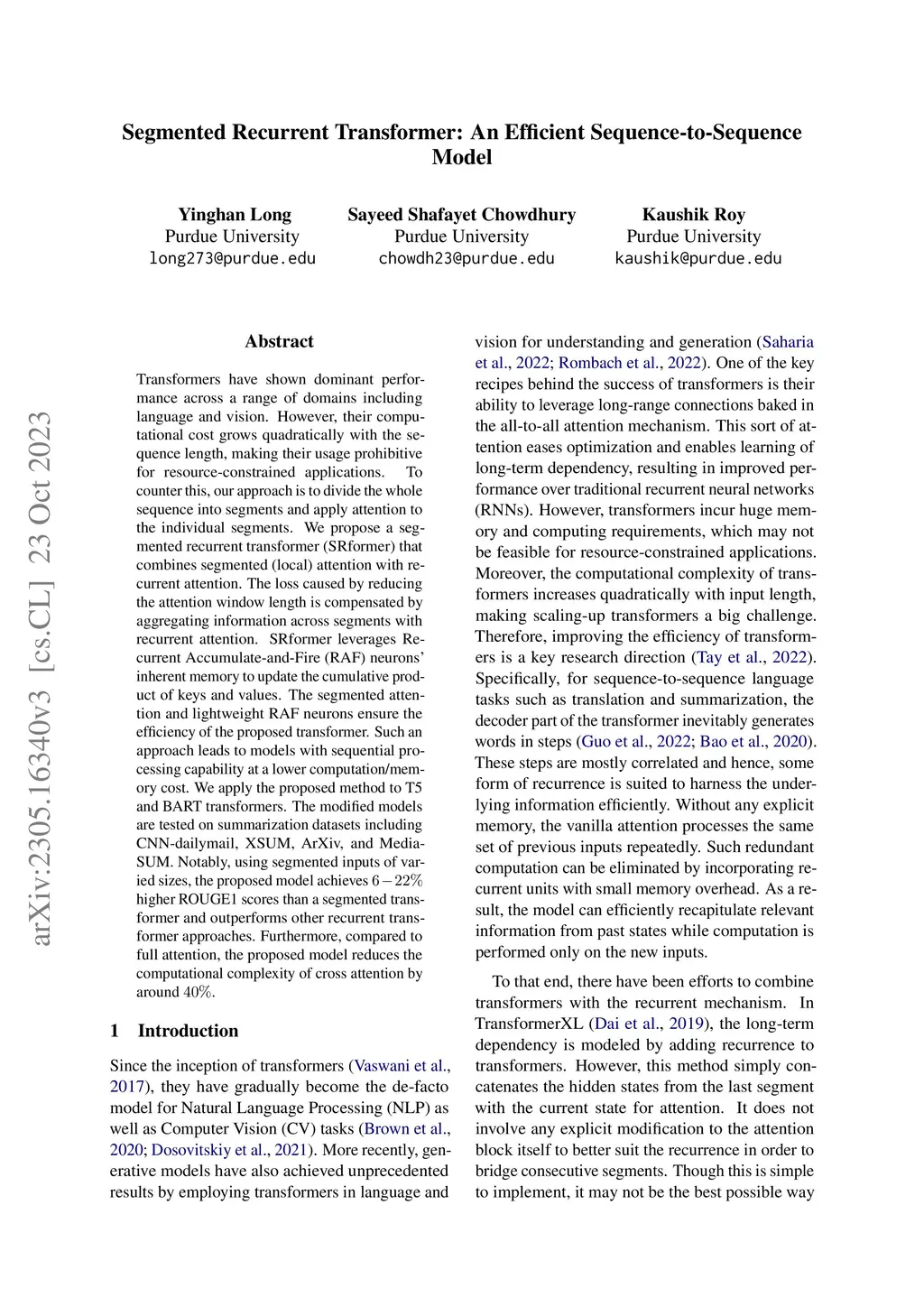 Transformers have shown dominant performance across a range of domains including language and vision. However, their computational cost grows quadratically with the sequence length, making their usage prohibitive for resource-constrained applications. To counter this, our approach is to divide the whole sequence into segments and apply attention to the individual segments. We propose a segmented recurrent transformer (SRformer) that combines segmented (local) attention with recurrent attention. The loss caused by reducing the attention window length is compensated by aggregating information across segments with recurrent attention. SRformer leverages Recurrent Accumulate-and-Fire (RAF) neurons' inherent memory to update the cumulative product of keys and values. The segmented attention and lightweight RAF neurons ensure the efficiency of the proposed transformer. Such an approach leads to models with sequential processing capability at a lower computation/memory cost. We apply the proposed method to T5 and BART transformers. The modified models are tested on summarization datasets including CNN-dailymail, XSUM, ArXiv, and MediaSUM. Notably, using segmented inputs of varied sizes, the proposed model achieves higher ROUGE1 scores than a segmented transformer and outperforms other recurrent transformer approaches. Furthermore, compared to full attention, the proposed model reduces the computational complexity of cross attention by around .