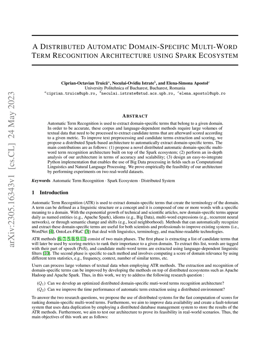 Automatic Term Recognition is used to extract domain-specific terms that belong to a given domain. In order to be accurate, these corpus and language-dependent methods require large volumes of textual data that need to be processed to extract candidate terms that are afterward scored according to a given metric. To improve text preprocessing and candidate terms extraction and scoring, we propose a distributed Spark-based architecture to automatically extract domain-specific terms. The main contributions are as follows: (1) propose a novel distributed automatic domain-specific multi-word term recognition architecture built on top of the Spark ecosystem; (2) perform an in-depth analysis of our architecture in terms of accuracy and scalability; (3) design an easy-to-integrate Python implementation that enables the use of Big Data processing in fields such as Computational Linguistics and Natural Language Processing. We prove empirically the feasibility of our architecture by performing experiments on two real-world datasets.