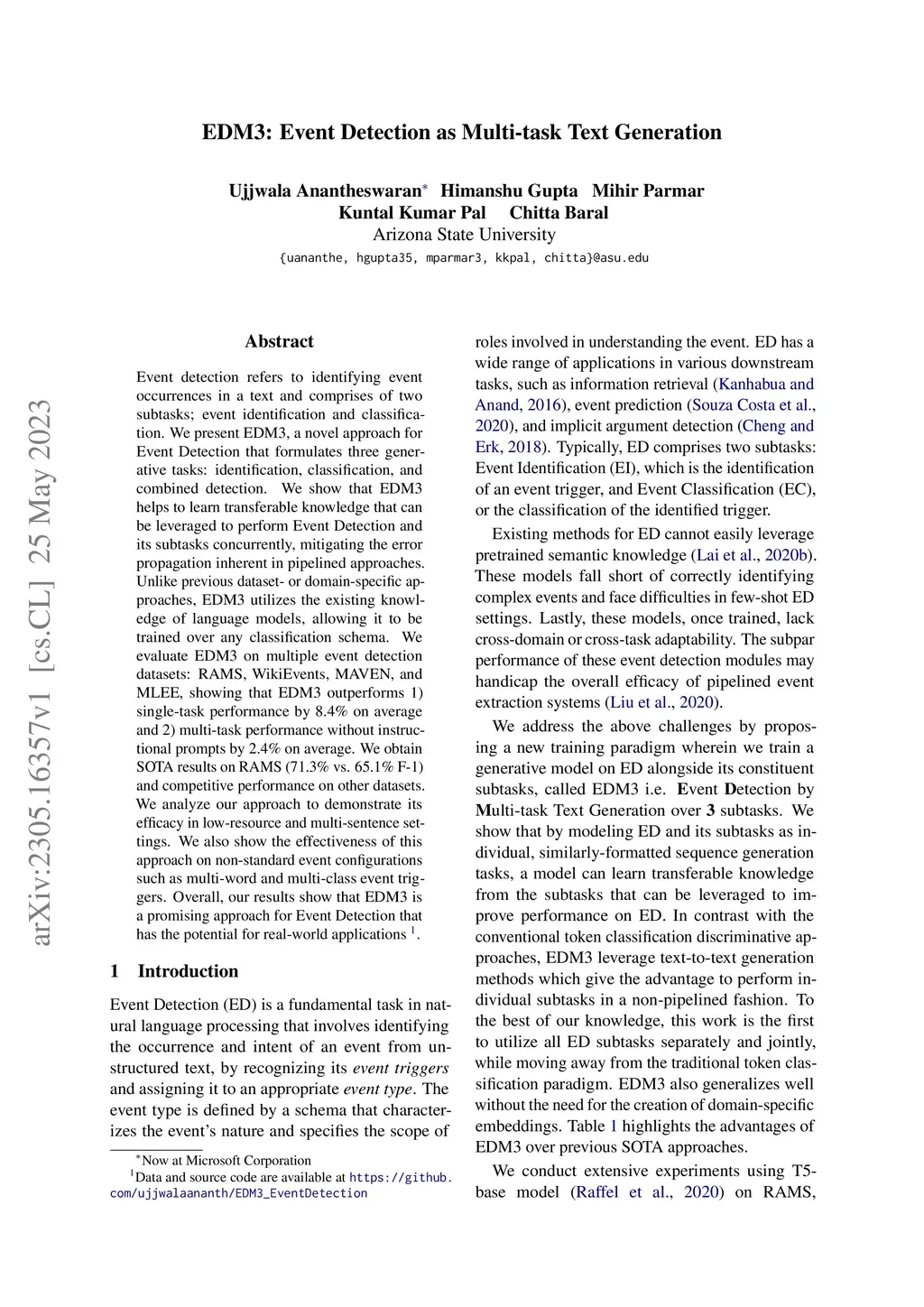 Event detection refers to identifying event occurrences in a text and comprises of two subtasks; event identification and classification. We present EDM3, a novel approach for Event Detection that formulates three generative tasks: identification, classification, and combined detection. We show that EDM3 helps to learn transferable knowledge that can be leveraged to perform Event Detection and its subtasks concurrently, mitigating the error propagation inherent in pipelined approaches. Unlike previous dataset- or domain-specific approaches, EDM3 utilizes the existing knowledge of language models, allowing it to be trained over any classification schema. We evaluate EDM3 on multiple event detection datasets: RAMS, WikiEvents, MAVEN, and MLEE, showing that EDM3 outperforms 1) single-task performance by 8.4% on average and 2) multi-task performance without instructional prompts by 2.4% on average. We obtain SOTA results on RAMS (71.3% vs. 65.1% F-1) and competitive performance on other datasets. We analyze our approach to demonstrate its efficacy in low-resource and multi-sentence settings. We also show the effectiveness of this approach on non-standard event configurations such as multi-word and multi-class event triggers. Overall, our results show that EDM3 is a promising approach for Event Detection that has the potential for real-world applications.