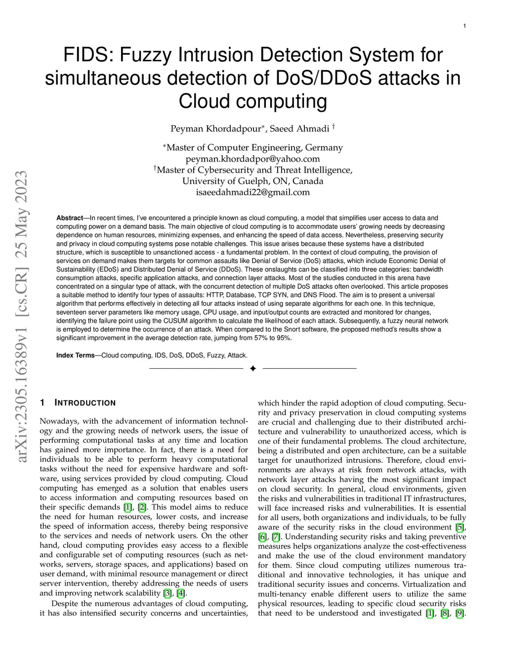 In recent times, I've encountered a principle known as cloud computing, a model that simplifies user access to data and computing power on a demand basis. The main objective of cloud computing is to accommodate users' growing needs by decreasing dependence on human resources, minimizing expenses, and enhancing the speed of data access. Nevertheless, preserving security and privacy in cloud computing systems pose notable challenges. This issue arises because these systems have a distributed structure, which is susceptible to unsanctioned access - a fundamental problem. In the context of cloud computing, the provision of services on demand makes them targets for common assaults like Denial of Service (DoS) attacks, which include Economic Denial of Sustainability (EDoS) and Distributed Denial of Service (DDoS). These onslaughts can be classified into three categories: bandwidth consumption attacks, specific application attacks, and connection layer attacks. Most of the studies conducted in this arena have concentrated on a singular type of attack, with the concurrent detection of multiple DoS attacks often overlooked. This article proposes a suitable method to identify four types of assaults: HTTP, Database, TCP SYN, and DNS Flood. The aim is to present a universal algorithm that performs effectively in detecting all four attacks instead of using separate algorithms for each one. In this technique, seventeen server parameters like memory usage, CPU usage, and input/output counts are extracted and monitored for changes, identifying the failure point using the CUSUM algorithm to calculate the likelihood of each attack. Subsequently, a fuzzy neural network is employed to determine the occurrence of an attack. When compared to the Snort software, the proposed method's results show a significant improvement in the average detection rate, jumping from 57% to 95%.