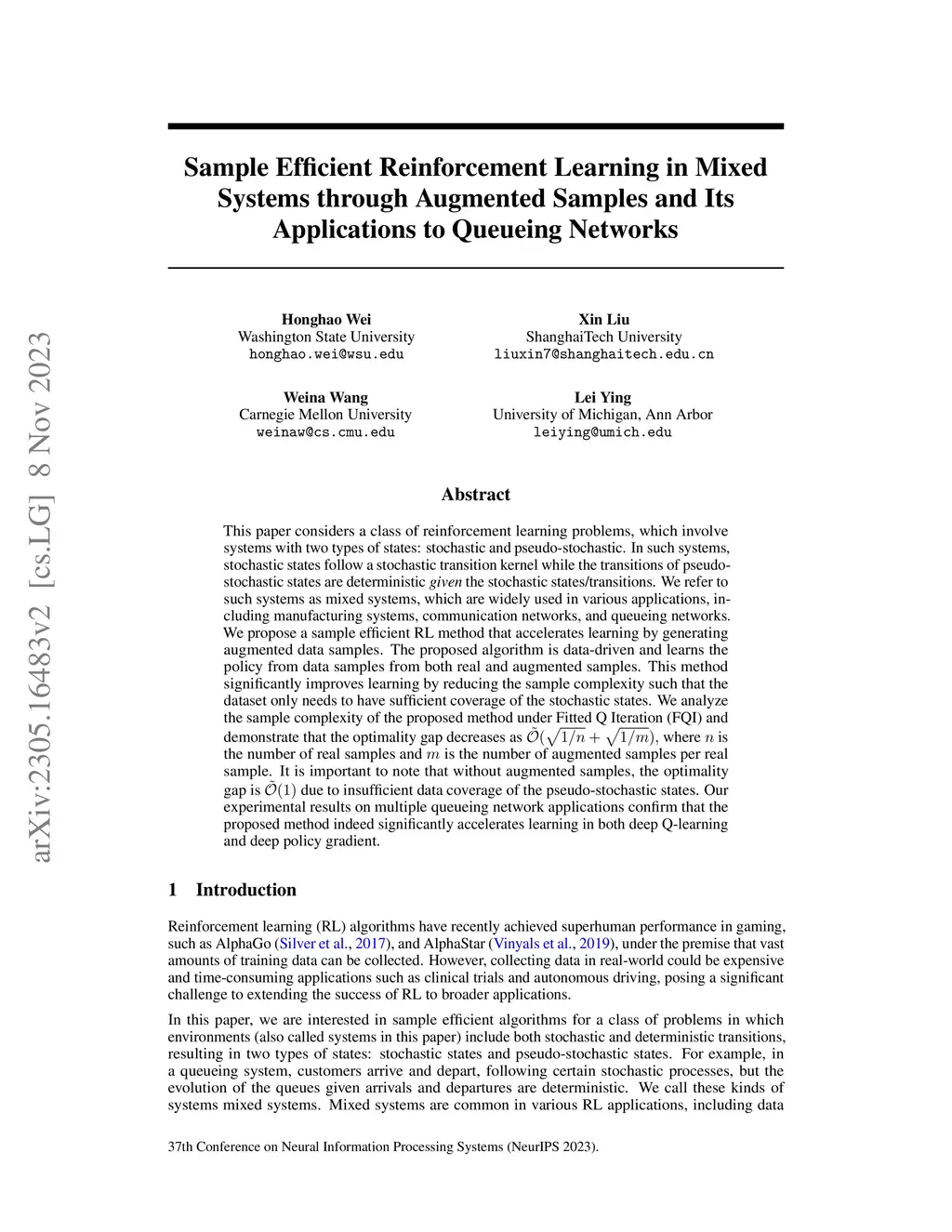 This paper considers a class of reinforcement learning problems, which involve systems with two types of states: stochastic and pseudo-stochastic. In such systems, stochastic states follow a stochastic transition kernel while the transitions of pseudo-stochastic states are deterministic given the stochastic states/transitions. We refer to such systems as mixed systems, which are widely used in various applications, including manufacturing systems, communication networks, and queueing networks. We propose a sample efficient RL method that accelerates learning by generating augmented data samples. The proposed algorithm is data-driven and learns the policy from data samples from both real and augmented samples. This method significantly improves learning by reducing the sample complexity such that the dataset only needs to have sufficient coverage of the stochastic states. We analyze the sample complexity of the proposed method under Fitted Q Iteration (FQI) and demonstrate that the optimality gap decreases as where is the number of real samples and is the number of augmented samples per real sample. It is important to note that without augmented samples, the optimality gap is due to insufficient data coverage of the pseudo-stochastic states. Our experimental results on multiple queueing network applications confirm that the proposed method indeed significantly accelerates learning in both deep Q-learning and deep policy gradient.