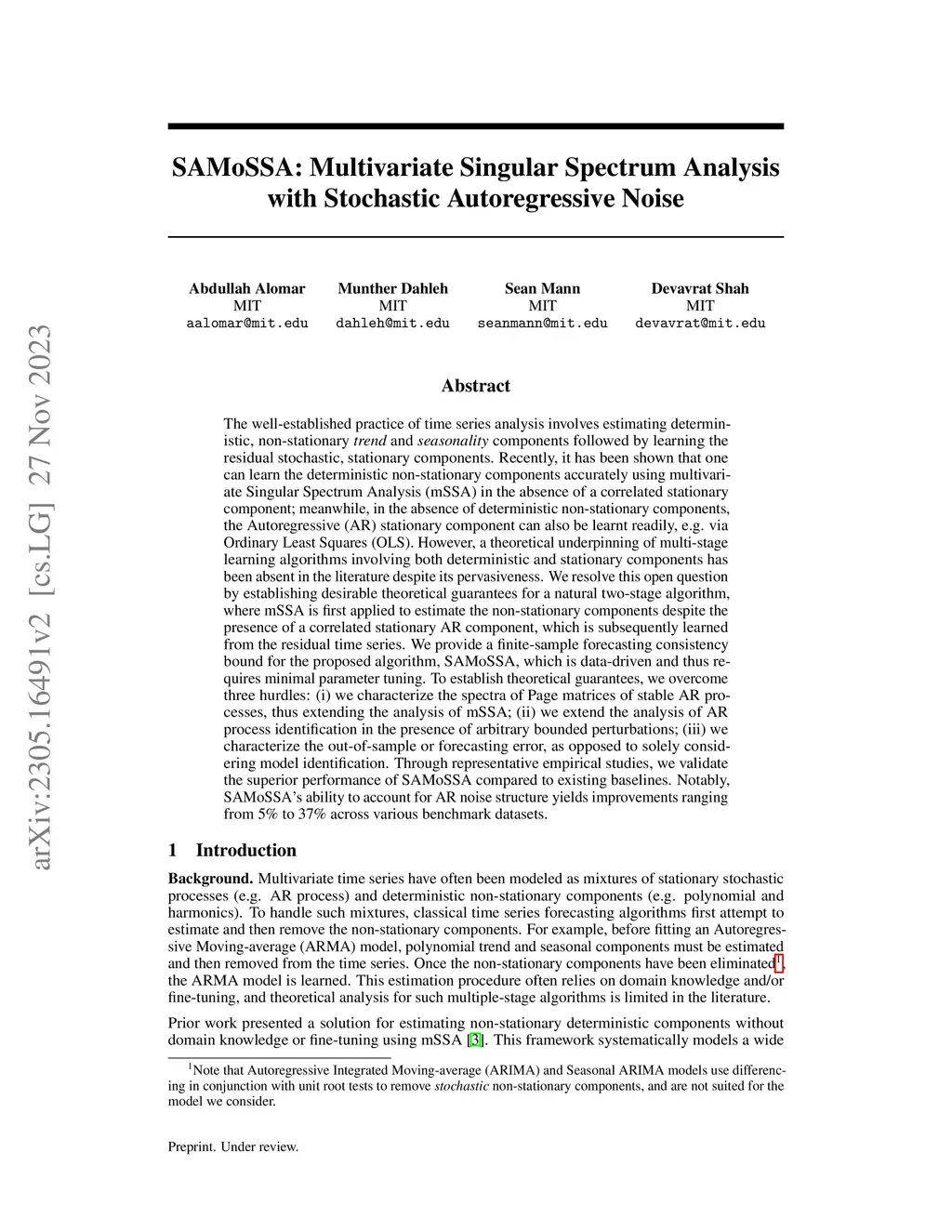 The well-established practice of time series analysis involves estimating deterministic, non-stationary trend and seasonality components followed by learning the residual stochastic, stationary components. Recently, it has been shown that one can learn the deterministic non-stationary components accurately using multivariate Singular Spectrum Analysis (mSSA) in the absence of a correlated stationary component; meanwhile, in the absence of deterministic non-stationary components, the Autoregressive (AR) stationary component can also be learnt readily, e.g. via Ordinary Least Squares (OLS). However, a theoretical underpinning of multi-stage learning algorithms involving both deterministic and stationary components has been absent in the literature despite its pervasiveness. We resolve this open question by establishing desirable theoretical guarantees for a natural two-stage algorithm, where mSSA is first applied to estimate the non-stationary components despite the presence of a correlated stationary AR component, which is subsequently learned from the residual time series. We provide a finite-sample forecasting consistency bound for the proposed algorithm, SAMoSSA, which is data-driven and thus requires minimal parameter tuning. To establish theoretical guarantees, we overcome three hurdles: (i) we characterize the spectra of Page matrices of stable AR processes, thus extending the analysis of mSSA; (ii) we extend the analysis of AR process identification in the presence of arbitrary bounded perturbations; (iii) we characterize the out-of-sample or forecasting error, as opposed to solely considering model identification. Through representative empirical studies, we validate the superior performance of SAMoSSA compared to existing baselines. Notably, SAMoSSA's ability to account for AR noise structure yields improvements ranging from 5% to 37% across various benchmark datasets.