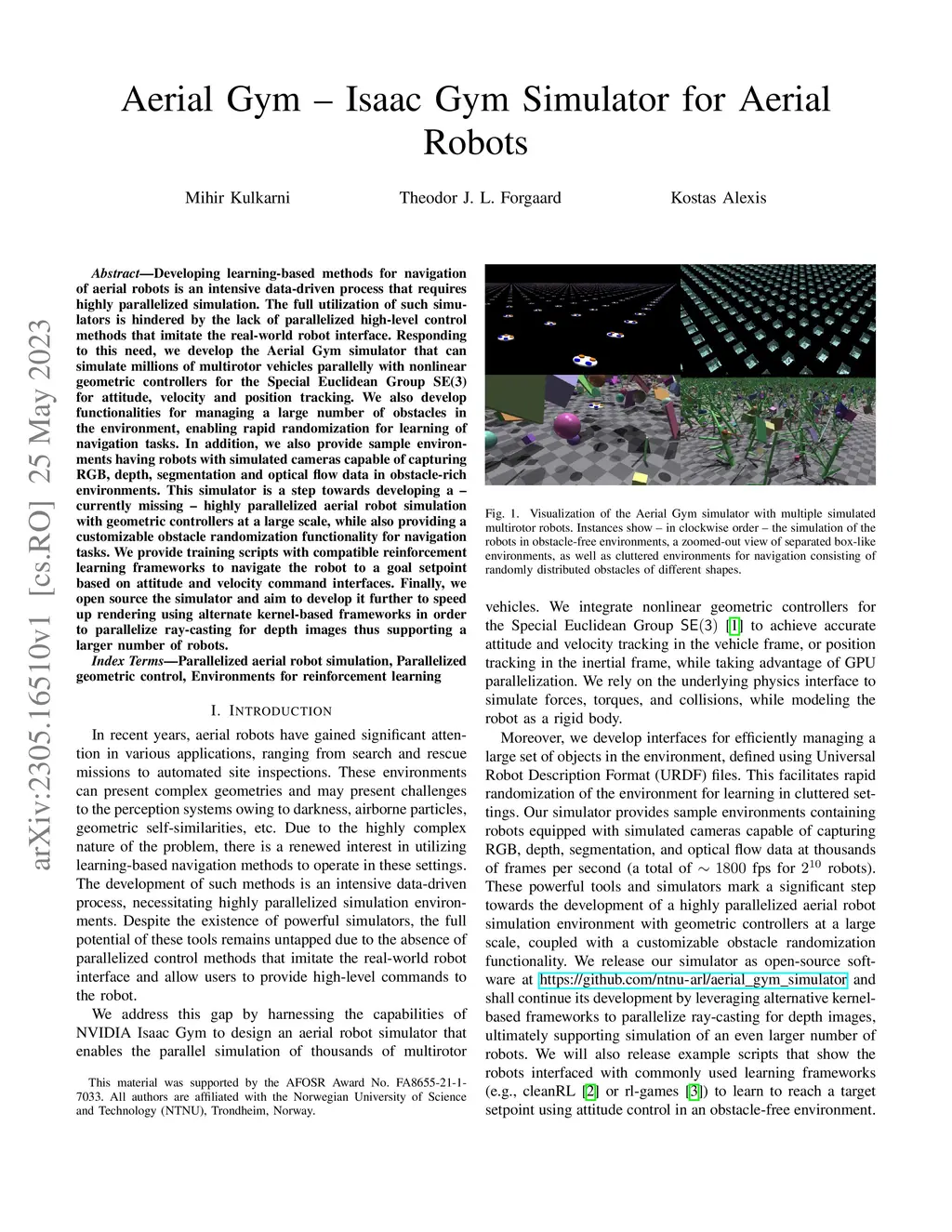 Developing learning-based methods for navigation of aerial robots is an intensive data-driven process that requires highly parallelized simulation. The full utilization of such simulators is hindered by the lack of parallelized high-level control methods that imitate the real-world robot interface. Responding to this need, we develop the Aerial Gym simulator that can simulate millions of multirotor vehicles parallelly with nonlinear geometric controllers for the Special Euclidean Group SE(3) for attitude, velocity and position tracking. We also develop functionalities for managing a large number of obstacles in the environment, enabling rapid randomization for learning of navigation tasks. In addition, we also provide sample environments having robots with simulated cameras capable of capturing RGB, depth, segmentation and optical flow data in obstacle-rich environments. This simulator is a step towards developing a - currently missing - highly parallelized aerial robot simulation with geometric controllers at a large scale, while also providing a customizable obstacle randomization functionality for navigation tasks. We provide training scripts with compatible reinforcement learning frameworks to navigate the robot to a goal setpoint based on attitude and velocity command interfaces. Finally, we open source the simulator and aim to develop it further to speed up rendering using alternate kernel-based frameworks in order to parallelize ray-casting for depth images thus supporting a larger number of robots.