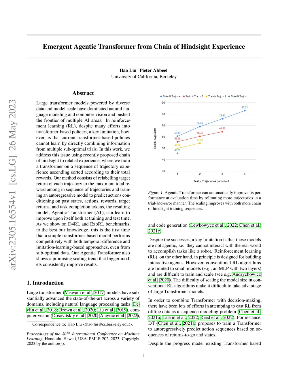 Large transformer models powered by diverse data and model scale have dominated natural language modeling and computer vision and pushed the frontier of multiple AI areas. In reinforcement learning (RL), despite many efforts into transformer-based policies, a key limitation, however, is that current transformer-based policies cannot learn by directly combining information from multiple sub-optimal trials. In this work, we address this issue using recently proposed chain of hindsight to relabel experience, where we train a transformer on a sequence of trajectory experience ascending sorted according to their total rewards. Our method consists of relabelling target return of each trajectory to the maximum total reward among in sequence of trajectories and training an autoregressive model to predict actions conditioning on past states, actions, rewards, target returns, and task completion tokens, the resulting model, Agentic Transformer (AT), can learn to improve upon itself both at training and test time. As we show on D4RL and ExoRL benchmarks, to the best our knowledge, this is the first time that a simple transformer-based model performs competitively with both temporal-difference and imitation-learning-based approaches, even from sub-optimal data. Our Agentic Transformer also shows a promising scaling trend that bigger models consistently improve results.