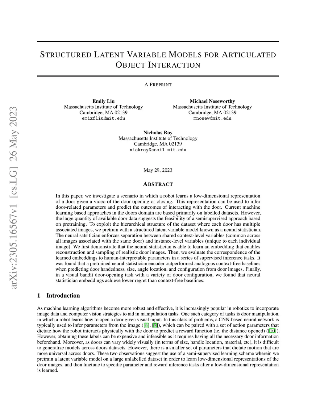 In this paper, we investigate a scenario in which a robot learns a low-dimensional representation of a door given a video of the door opening or closing. This representation can be used to infer door-related parameters and predict the outcomes of interacting with the door. Current machine learning based approaches in the doors domain are based primarily on labelled datasets. However, the large quantity of available door data suggests the feasibility of a semisupervised approach based on pretraining. To exploit the hierarchical structure of the dataset where each door has multiple associated images, we pretrain with a structured latent variable model known as a neural statistician. The neural satsitician enforces separation between shared context-level variables (common across all images associated with the same door) and instance-level variables (unique to each individual image). We first demonstrate that the neural statistician is able to learn an embedding that enables reconstruction and sampling of realistic door images. Then, we evaluate the correspondence of the learned embeddings to human-interpretable parameters in a series of supervised inference tasks. It was found that a pretrained neural statistician encoder outperformed analogous context-free baselines when predicting door handedness, size, angle location, and configuration from door images. Finally, in a visual bandit door-opening task with a variety of door configuration, we found that neural statistician embeddings achieve lower regret than context-free baselines.