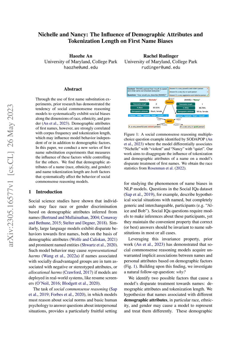 Through the use of first name substitution experiments, prior research has demonstrated the tendency of social commonsense reasoning models to systematically exhibit social biases along the dimensions of race, ethnicity, and gender (An et al., 2023). Demographic attributes of first names, however, are strongly correlated with corpus frequency and tokenization length, which may influence model behavior independent of or in addition to demographic factors. In this paper, we conduct a new series of first name substitution experiments that measures the influence of these factors while controlling for the others. We find that demographic attributes of a name (race, ethnicity, and gender) and name tokenization length are both factors that systematically affect the behavior of social commonsense reasoning models.