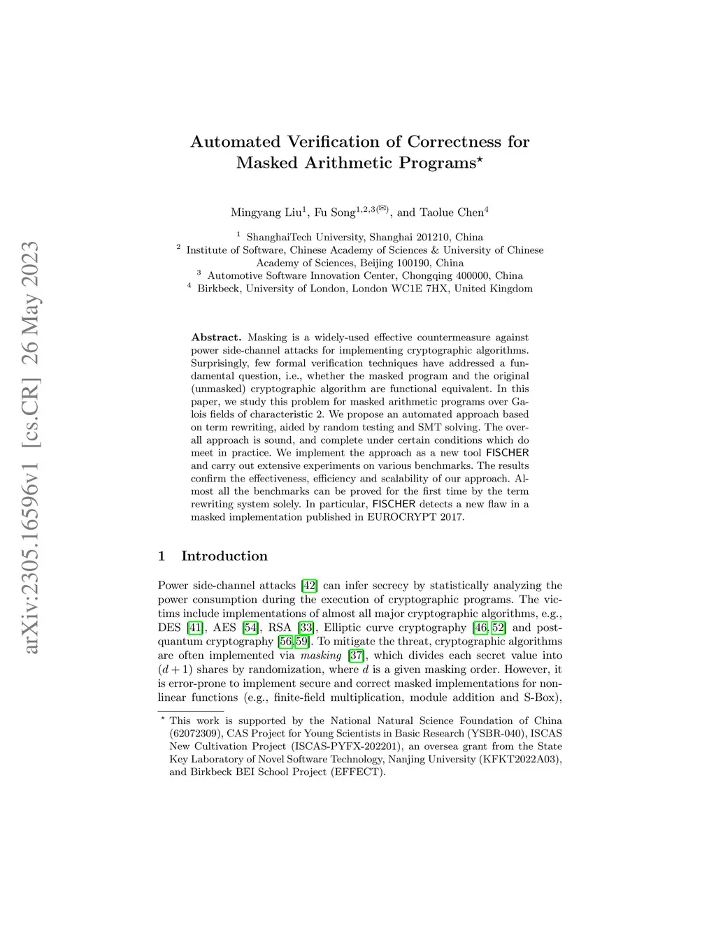 Masking is a widely-used effective countermeasure against power side-channel attacks for implementing cryptographic algorithms. Surprisingly, few formal verification techniques have addressed a fundamental question, i.e., whether the masked program and the original (unmasked) cryptographic algorithm are functional equivalent. In this paper, we study this problem for masked arithmetic programs over Galois fields of characteristic 2. We propose an automated approach based on term rewriting, aided by random testing and SMT solving. The overall approach is sound, and complete under certain conditions which do meet in practice. We implement the approach as a new tool FISCHER and carry out extensive experiments on various benchmarks. The results confirm the effectiveness, efficiency and scalability of our approach. Almost all the benchmarks can be proved for the first time by the term rewriting system solely. In particular, FISCHER detects a new flaw in a masked implementation published in EUROCRYPT 2017.