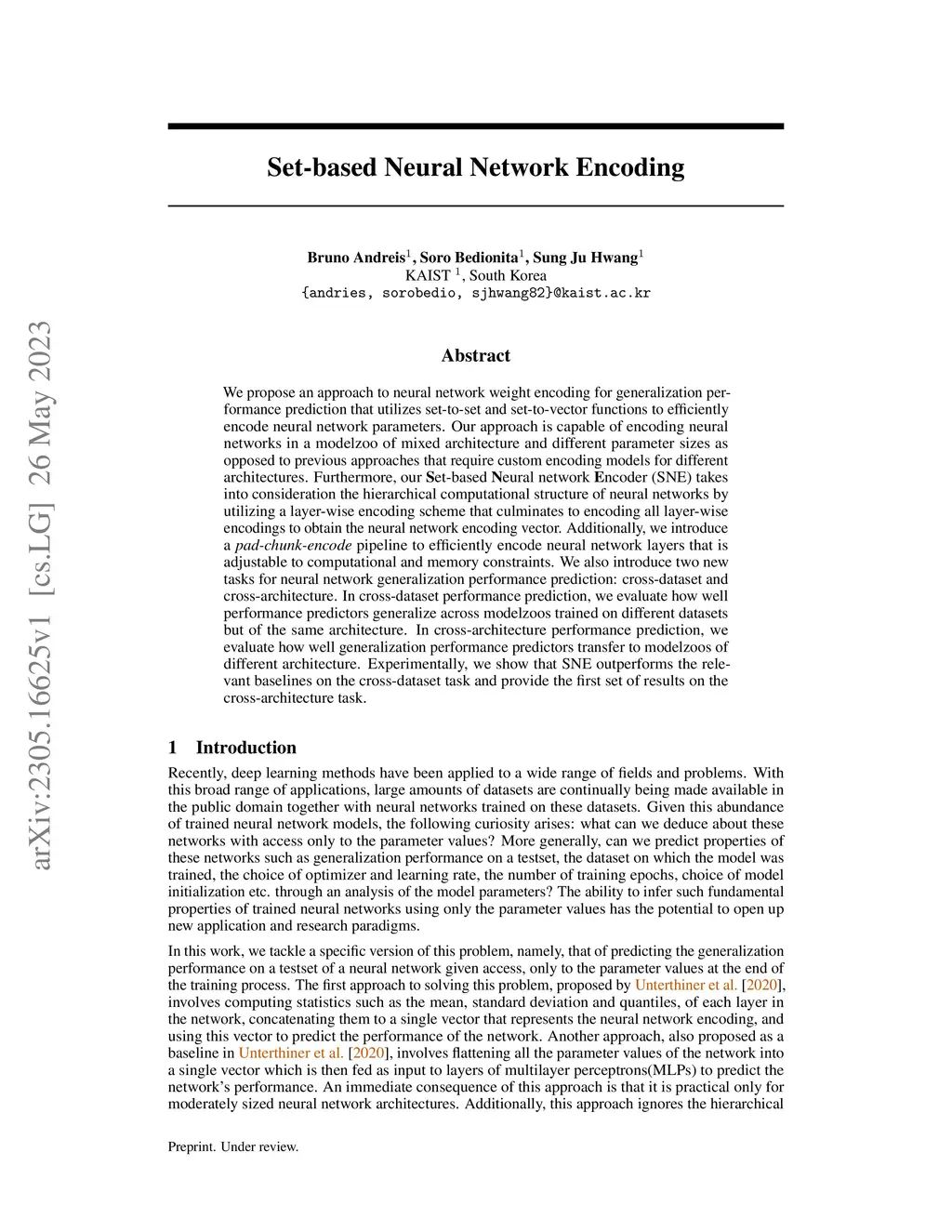 We propose a neural network weight encoding method for network property prediction that utilizes set-to-set and set-to-vector functions to efficiently encode neural network parameters. Our approach is capable of encoding neural networks in a model zoo of mixed architecture and different parameter sizes as opposed to previous approaches that require custom encoding models for different architectures. Furthermore, our \textbf{S}et-based \textbf{N}eural network \textbf{E}ncoder (SNE) takes into consideration the hierarchical computational structure of neural networks. To respect symmetries inherent in network weight space, we utilize Logit Invariance to learn the required minimal invariance properties. Additionally, we introduce a \textit{pad-chunk-encode} pipeline to efficiently encode neural network layers that is adjustable to computational and memory constraints. We also introduce two new tasks for neural network property prediction: cross-dataset and cross-architecture. In cross-dataset property prediction, we evaluate how well property predictors generalize across model zoos trained on different datasets but of the same architecture. In cross-architecture property prediction, we evaluate how well property predictors transfer to model zoos of different architecture not seen during training. We show that SNE outperforms the relevant baselines on standard benchmarks.