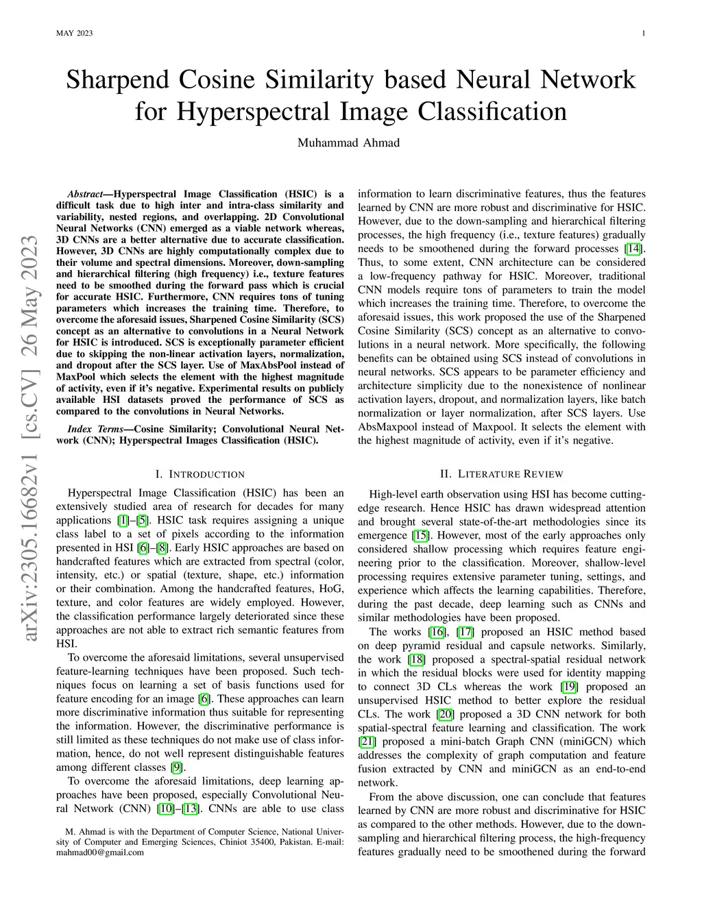 Sharpend Cosine Similarity based Neural Network for Hyperspectral Image