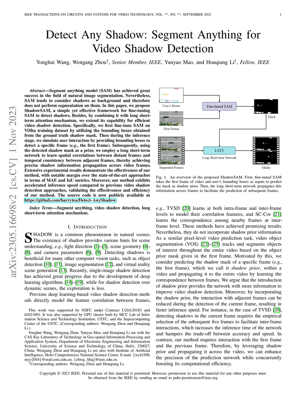 Segment anything model (SAM) has achieved great success in the field of natural image segmentation. Nevertheless, SAM tends to consider shadows as background and therefore does not perform segmentation on them. In this paper, we propose ShadowSAM, a simple yet effective framework for fine-tuning SAM to detect shadows. Besides, by combining it with long short-term attention mechanism, we extend its capability for efficient video shadow detection. Specifically, we first fine-tune SAM on ViSha training dataset by utilizing the bounding boxes obtained from the ground truth shadow mask. Then during the inference stage, we simulate user interaction by providing bounding boxes to detect a specific frame (e.g., the first frame). Subsequently, using the detected shadow mask as a prior, we employ a long short-term network to learn spatial correlations between distant frames and temporal consistency between adjacent frames, thereby achieving precise shadow information propagation across video frames. Extensive experimental results demonstrate the effectiveness of our method, with notable margin over the state-of-the-art approaches in terms of MAE and IoU metrics. Moreover, our method exhibits accelerated inference speed compared to previous video shadow detection approaches, validating the effectiveness and efficiency of our method. The source code is now publicly available at https://github.com/harrytea/Detect-AnyShadow.