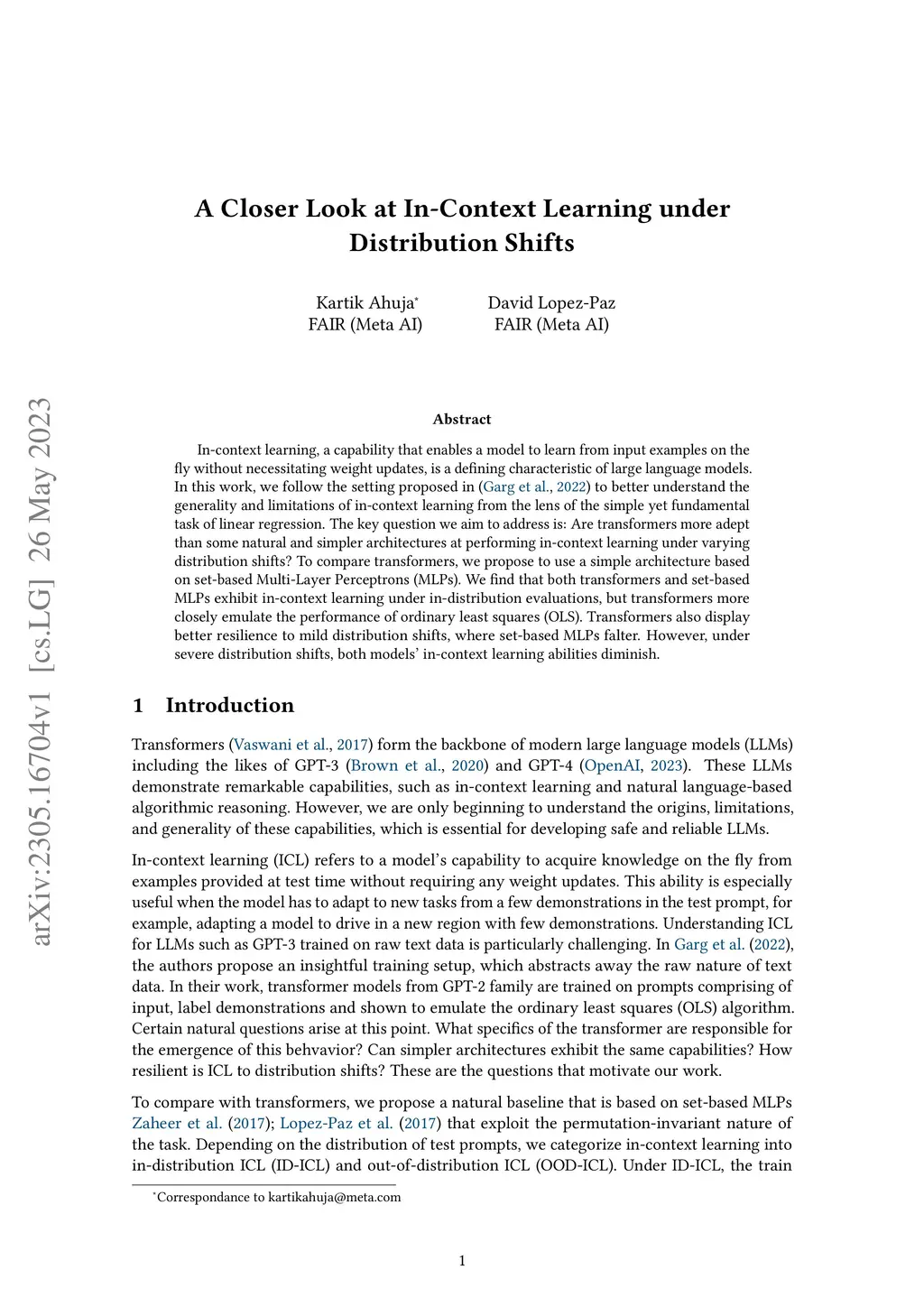In-context learning, a capability that enables a model to learn from input examples on the fly without necessitating weight updates, is a defining characteristic of large language models. In this work, we follow the setting proposed in (Garg et al., 2022) to better understand the generality and limitations of in-context learning from the lens of the simple yet fundamental task of linear regression. The key question we aim to address is: Are transformers more adept than some natural and simpler architectures at performing in-context learning under varying distribution shifts? To compare transformers, we propose to use a simple architecture based on set-based Multi-Layer Perceptrons (MLPs). We find that both transformers and set-based MLPs exhibit in-context learning under in-distribution evaluations, but transformers more closely emulate the performance of ordinary least squares (OLS). Transformers also display better resilience to mild distribution shifts, where set-based MLPs falter. However, under severe distribution shifts, both models' in-context learning abilities diminish.