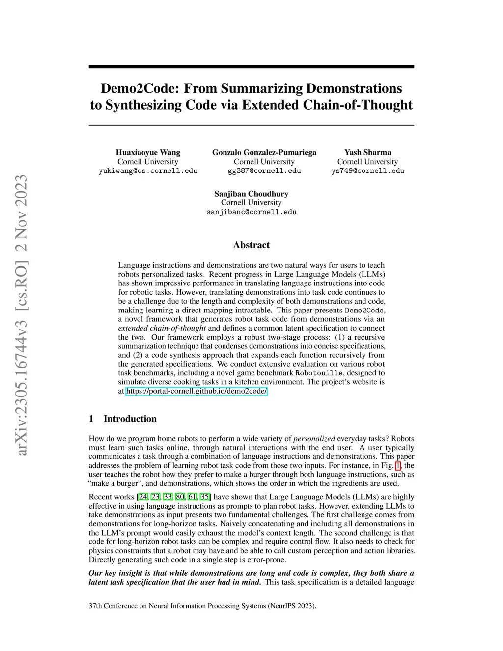 Language instructions and demonstrations are two natural ways for users to teach robots personalized tasks. Recent progress in Large Language Models (LLMs) has shown impressive performance in translating language instructions into code for robotic tasks. However, translating demonstrations into task code continues to be a challenge due to the length and complexity of both demonstrations and code, making learning a direct mapping intractable. This paper presents Demo2Code, a novel framework that generates robot task code from demonstrations via an extended chain-of-thought and defines a common latent specification to connect the two. Our framework employs a robust two-stage process: (1) a recursive summarization technique that condenses demonstrations into concise specifications, and (2) a code synthesis approach that expands each function recursively from the generated specifications. We conduct extensive evaluation on various robot task benchmarks, including a novel game benchmark Robotouille, designed to simulate diverse cooking tasks in a kitchen environment. The project's website is available at https://portal-cornell.github.io/demo2code/
