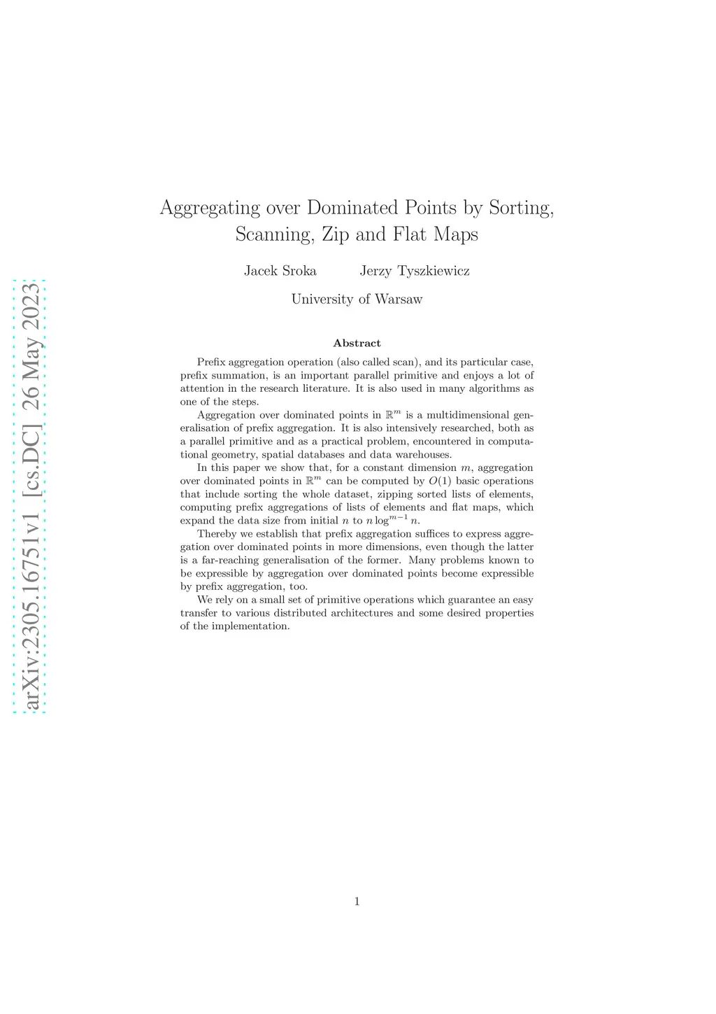 Prefix aggregation operation (also called scan), and its particular case, prefix summation, is an important parallel primitive and enjoys a lot of attention in the research literature. It is also used in many algorithms as one of the steps. Aggregation over dominated points in is a multidimensional generalisation of prefix aggregation. It is also intensively researched, both as a parallel primitive and as a practical problem, encountered in computational geometry, spatial databases and data warehouses. In this paper we show that, for a constant dimension , aggregation over dominated points in can be computed by basic operations that include sorting the whole dataset, zipping sorted lists of elements, computing prefix aggregations of lists of elements and flat maps, which expand the data size from initial to . Thereby we establish that prefix aggregation suffices to express aggregation over dominated points in more dimensions, even though the latter is a far-reaching generalisation of the former. Many problems known to be expressible by aggregation over dominated points become expressible by prefix aggregation, too. We rely on a small set of primitive operations which guarantee an easy transfer to various distributed architectures and some desired properties of the implementation.