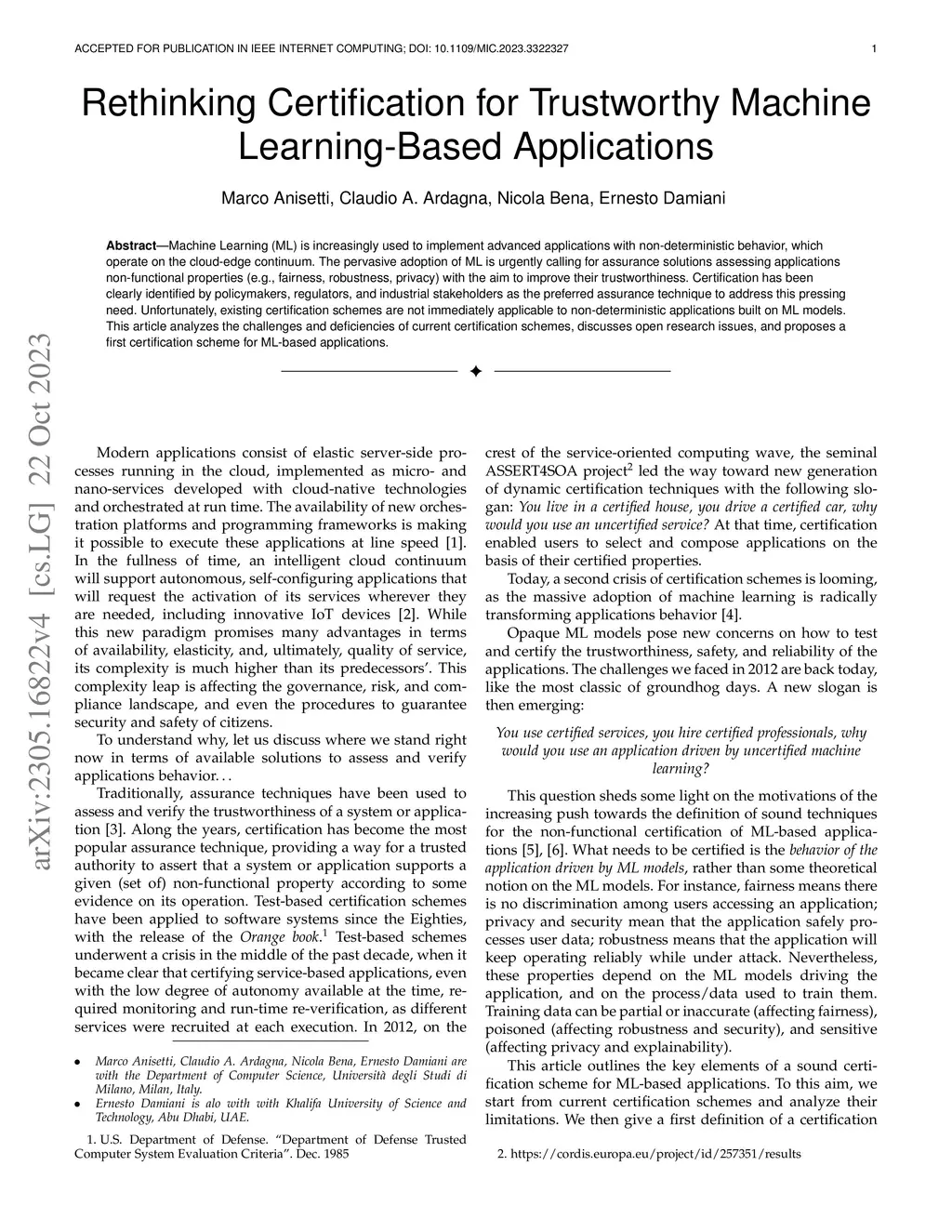 Machine Learning (ML) is increasingly used to implement advanced applications with non-deterministic behavior, which operate on the cloud-edge continuum. The pervasive adoption of ML is urgently calling for assurance solutions assessing applications non-functional properties (e.g., fairness, robustness, privacy) with the aim to improve their trustworthiness. Certification has been clearly identified by policymakers, regulators, and industrial stakeholders as the preferred assurance technique to address this pressing need. Unfortunately, existing certification schemes are not immediately applicable to non-deterministic applications built on ML models. This article analyzes the challenges and deficiencies of current certification schemes, discusses open research issues, and proposes a first certification scheme for ML-based applications.