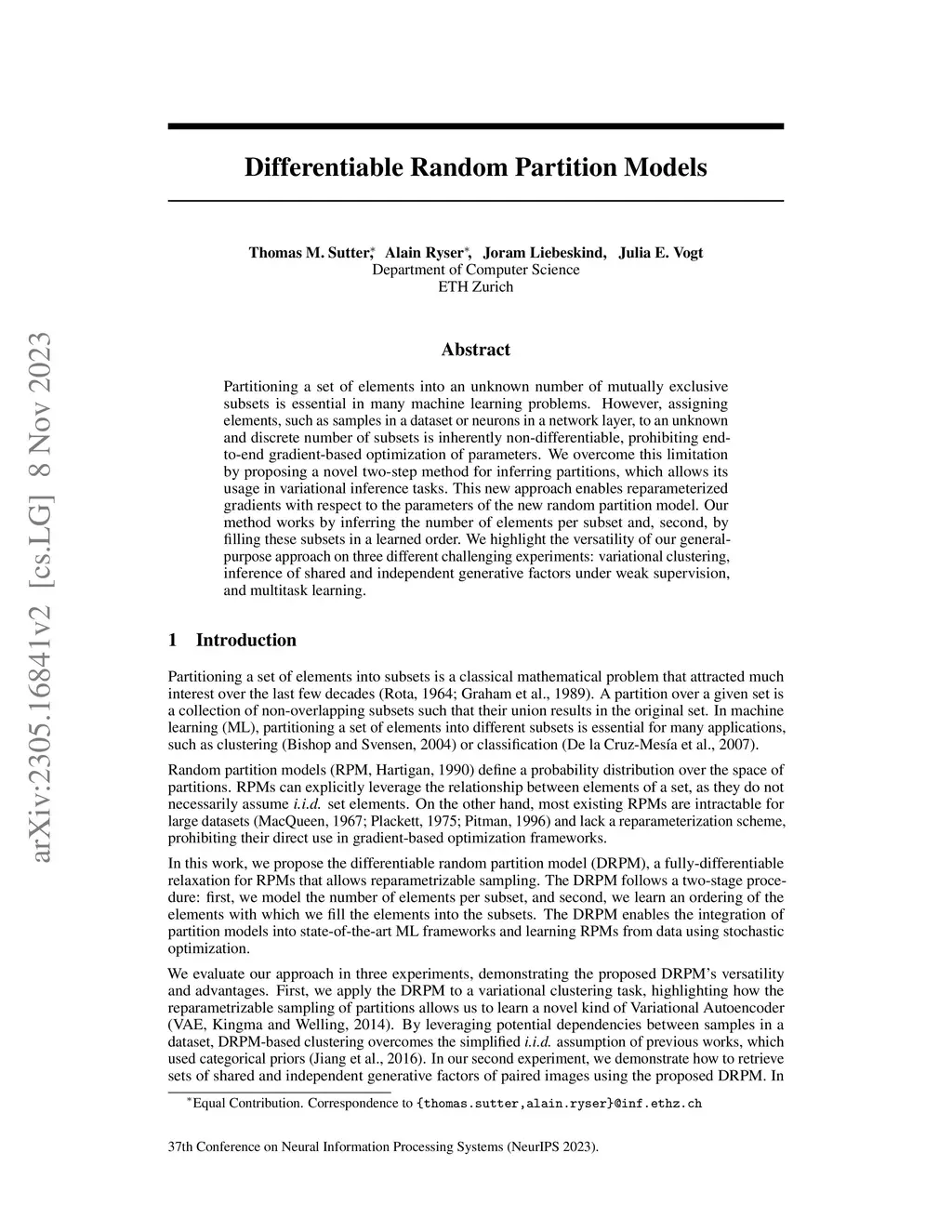 Partitioning a set of elements into an unknown number of mutually exclusive subsets is essential in many machine learning problems. However, assigning elements, such as samples in a dataset or neurons in a network layer, to an unknown and discrete number of subsets is inherently non-differentiable, prohibiting end-to-end gradient-based optimization of parameters. We overcome this limitation by proposing a novel two-step method for inferring partitions, which allows its usage in variational inference tasks. This new approach enables reparameterized gradients with respect to the parameters of the new random partition model. Our method works by inferring the number of elements per subset and, second, by filling these subsets in a learned order. We highlight the versatility of our general-purpose approach on three different challenging experiments: variational clustering, inference of shared and independent generative factors under weak supervision, and multitask learning.