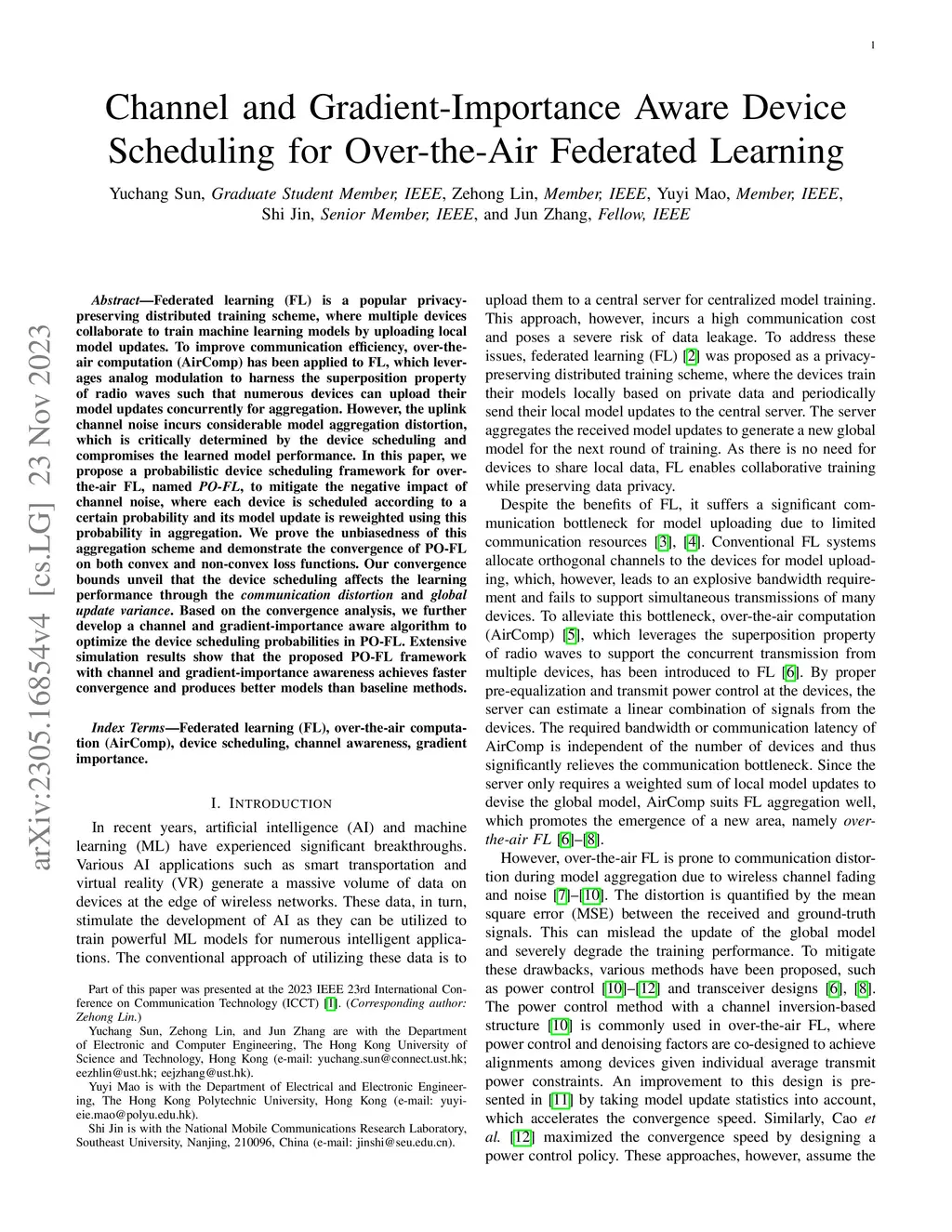 Federated learning (FL) is a popular privacy-preserving distributed training scheme, where multiple devices collaborate to train machine learning models by uploading local model updates. To improve communication efficiency, over-the-air computation (AirComp) has been applied to FL, which leverages analog modulation to harness the superposition property of radio waves such that numerous devices can upload their model updates concurrently for aggregation. However, the uplink channel noise incurs considerable model aggregation distortion, which is critically determined by the device scheduling and compromises the learned model performance. In this paper, we propose a probabilistic device scheduling framework for over-the-air FL, named PO-FL, to mitigate the negative impact of channel noise, where each device is scheduled according to a certain probability and its model update is reweighted using this probability in aggregation. We prove the unbiasedness of this aggregation scheme and demonstrate the convergence of PO-FL on both convex and non-convex loss functions. Our convergence bounds unveil that the device scheduling affects the learning performance through the communication distortion and global update variance. Based on the convergence analysis, we further develop a channel and gradient-importance aware algorithm to optimize the device scheduling probabilities in PO-FL. Extensive simulation results show that the proposed PO-FL framework with channel and gradient-importance awareness achieves faster convergence and produces better models than baseline methods.