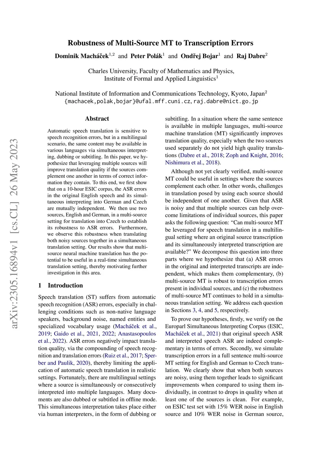 Automatic speech translation is sensitive to speech recognition errors, but in a multilingual scenario, the same content may be available in various languages via simultaneous interpreting, dubbing or subtitling. In this paper, we hypothesize that leveraging multiple sources will improve translation quality if the sources complement one another in terms of correct information they contain. To this end, we first show that on a 10-hour ESIC corpus, the ASR errors in the original English speech and its simultaneous interpreting into German and Czech are mutually independent. We then use two sources, English and German, in a multi-source setting for translation into Czech to establish its robustness to ASR errors. Furthermore, we observe this robustness when translating both noisy sources together in a simultaneous translation setting. Our results show that multi-source neural machine translation has the potential to be useful in a real-time simultaneous translation setting, thereby motivating further investigation in this area.